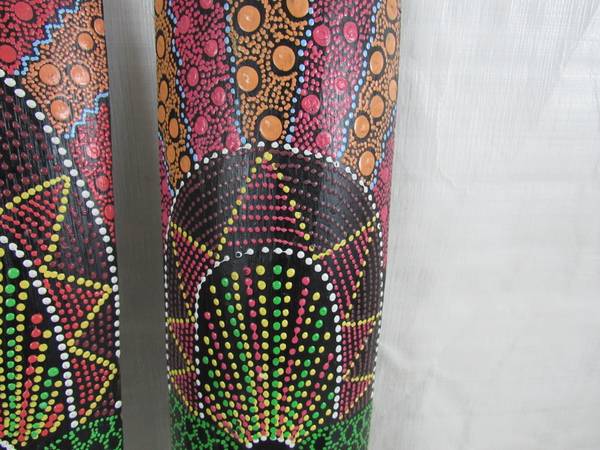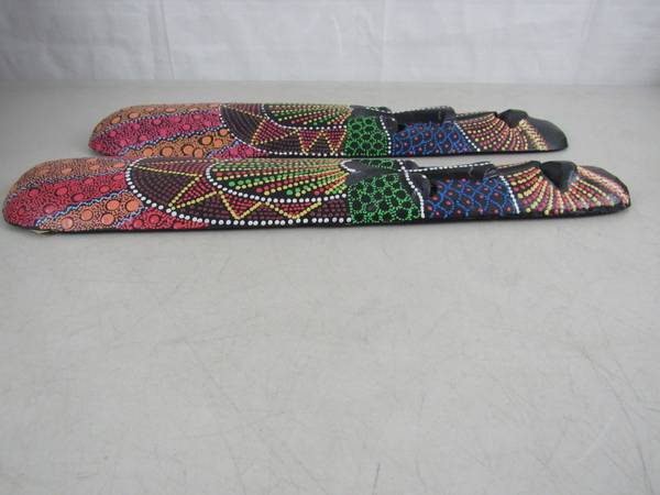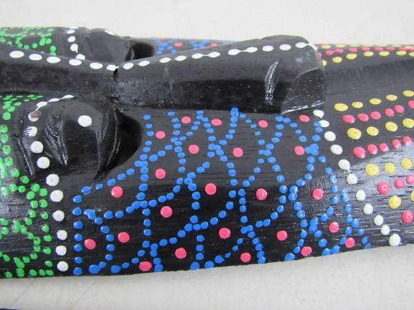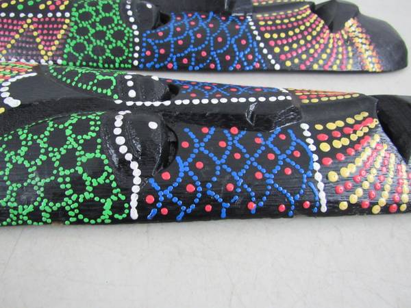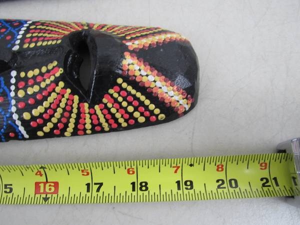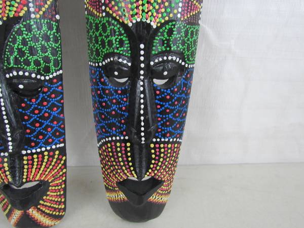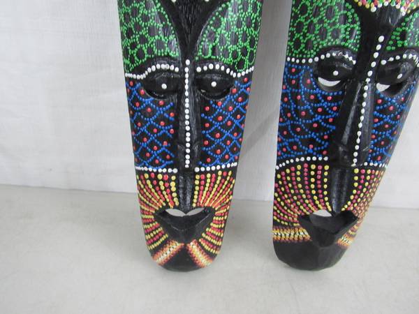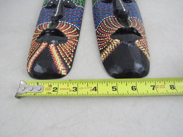 The masks are 19 5/8" tall X 4 1/2" width at it's widest point approximately. Good condition with some minor age and usage wear. No broken or missing parts. See photo's