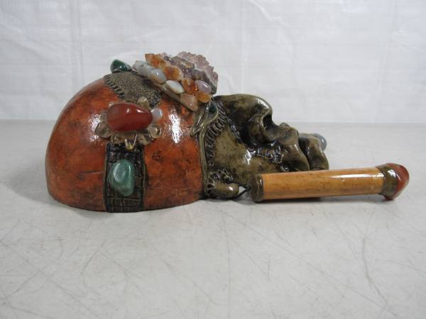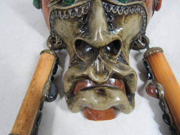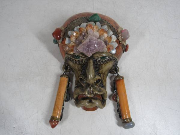 The mask is 10 1/4" height X 7 1/4" width. Made of a Gourd shell, wood, and real Gemstones. Good condition. No broken or missing parts. See photo's