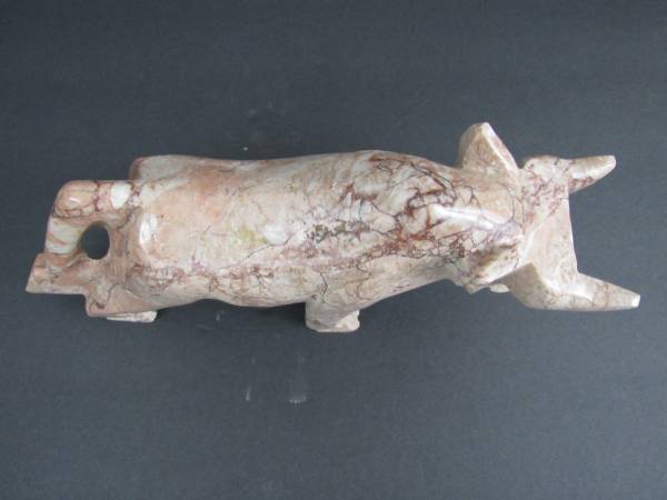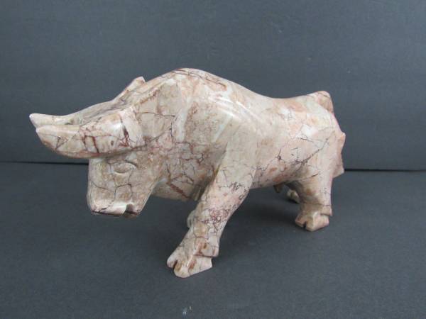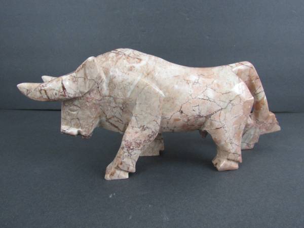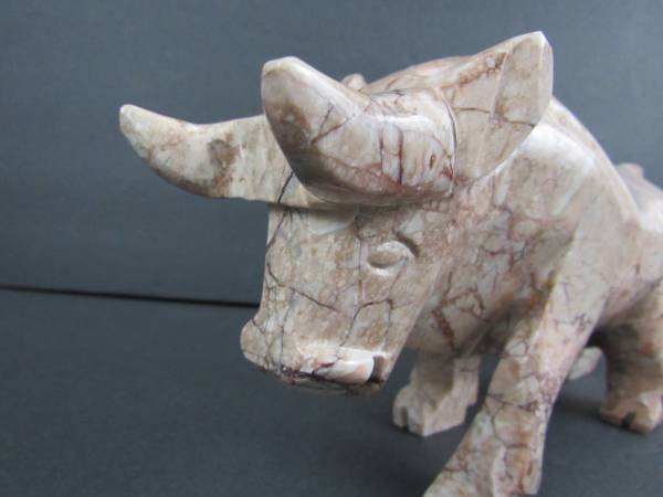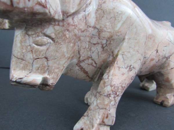 The Bull is 11 3/4" length X 5" height X 2 3/4" width. Made of marble onyx type of stone, and weighs 5 pounds. Good condition. No chips, cracks, broken or missing parts. See photo's