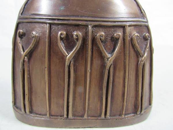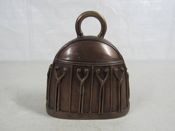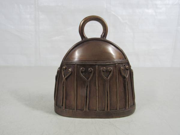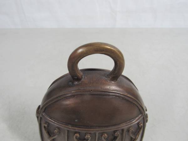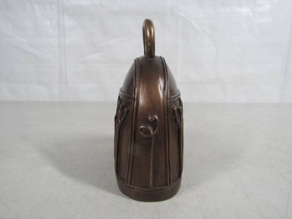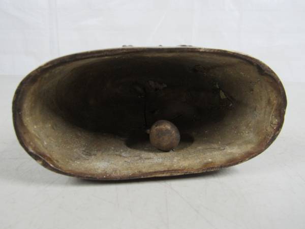 The bell is 5 3/4" height X 5 1/8" width X 2 9/16" depth. Made of solid brass with a copper./bronze tone finish. Weighs 1 pound 14 ounces. Good condition with some minor age and usage wear. See...