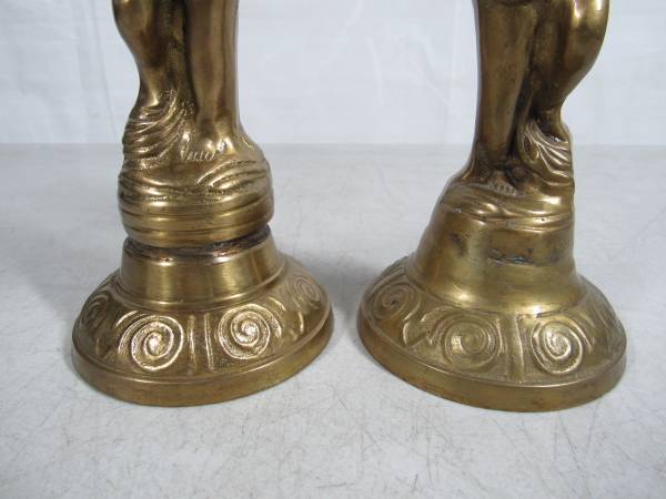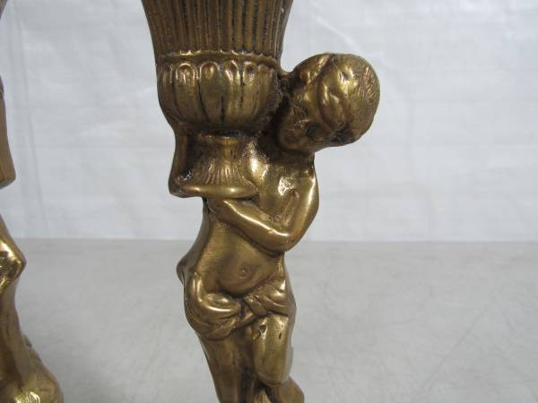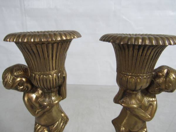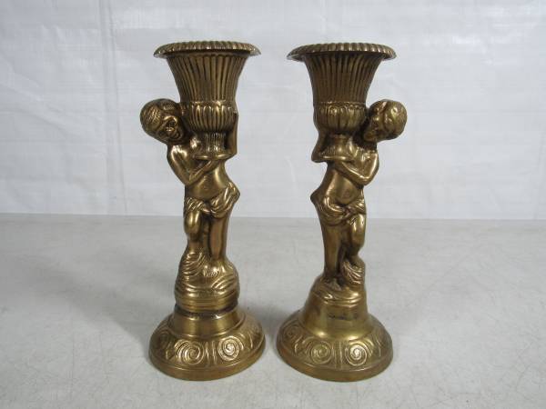 Each candlestick holder is 7 3/8" tall, and will hold a 7/8" diameter candlestick, and weigh 2 pounds 14 ounces together. Made of solid brass, and are in very good condition. No broken or missing...