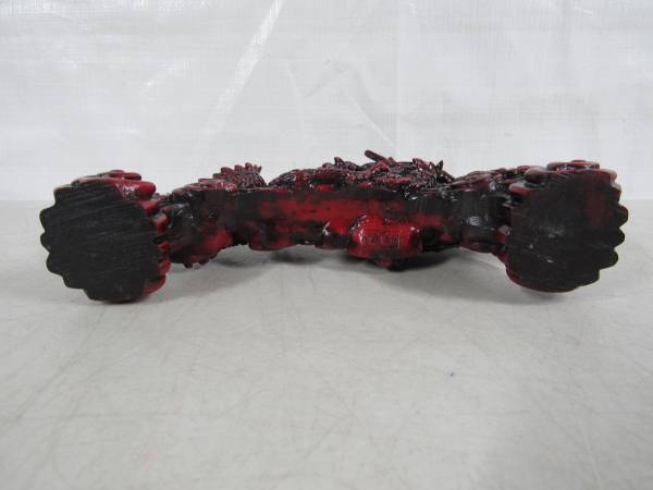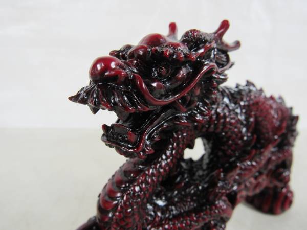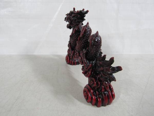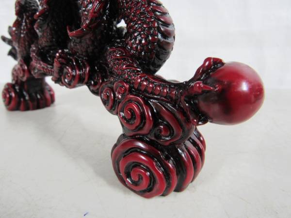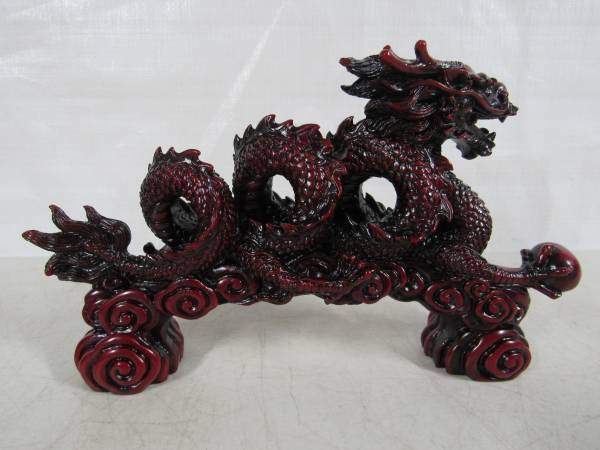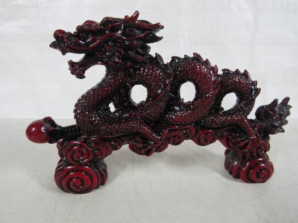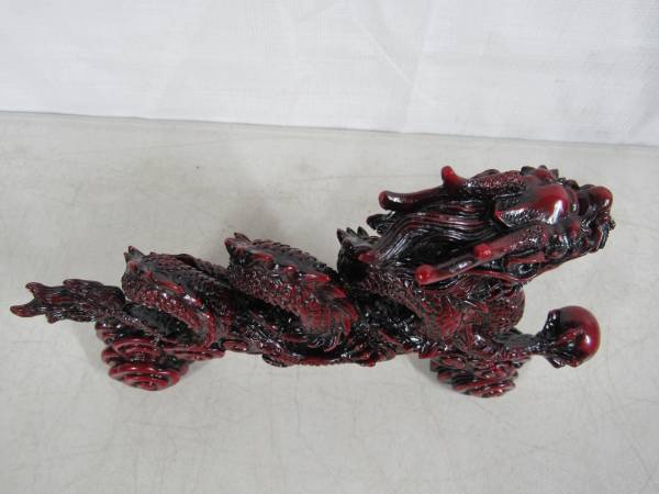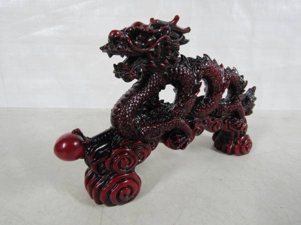 The Dragon is 8" length X 4 7/8" height X 1 1/2" width, and weighs 1 pound. Made of a red colored epoxy or resin type of material. Comes with original box. The Dragon has never out of box for display. Only for inspection, and listing photos. Very good unused condition. Box has some storage wear, and paper peel sections from being taped closed.