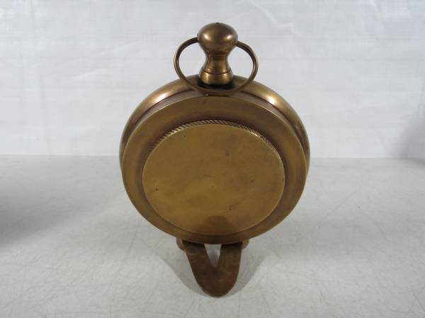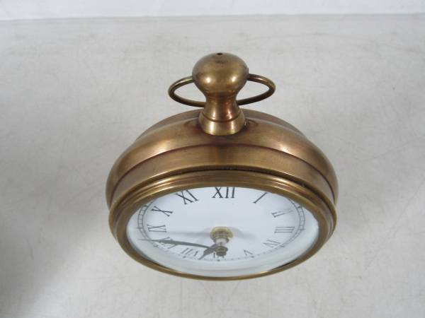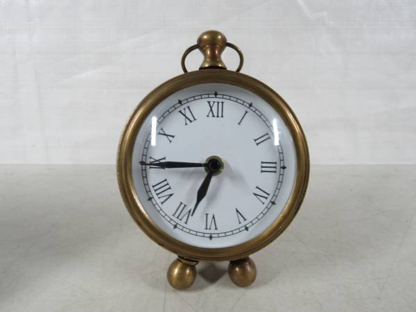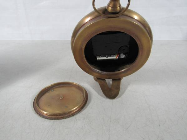 The clock is 6 1/2" height X 4 3/4" width X 2" depth not including the stand. Made of solid brass, with a glass lens, and weighs 1 pound 12 ounces. The clock inside is plastic with a quartz movement. Good working condition. The only issue is two scratch marks in the center area of the glass lens, and the longest one is 1/4" length. Uses one "AA" battery that is not included.