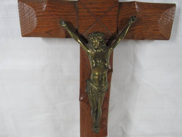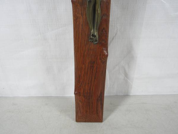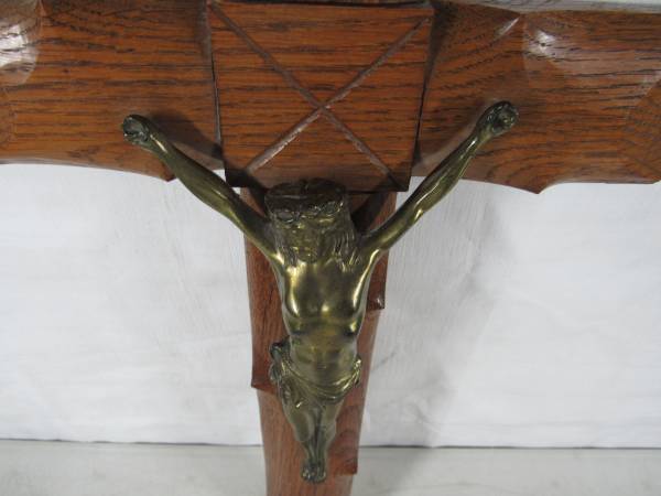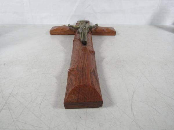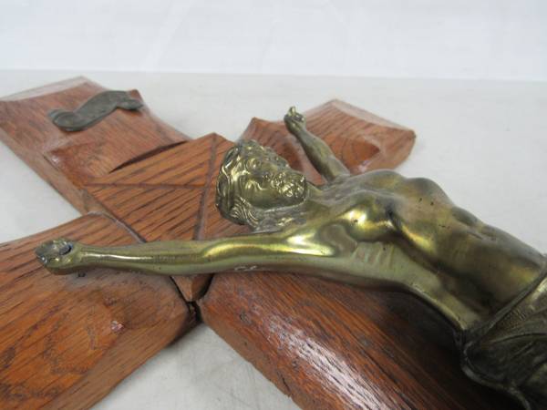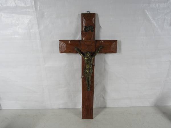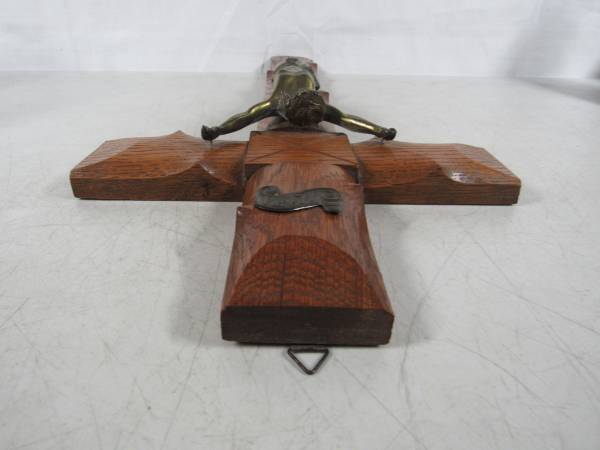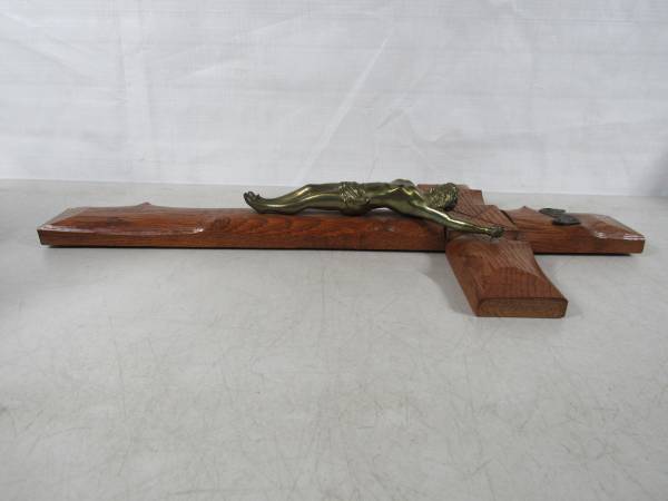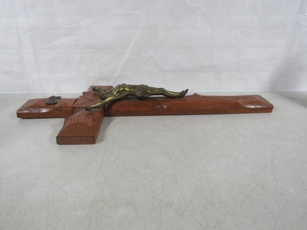 The Crucifix is 19 13/16" height X 9 7/8" width. Made of hand carved oak wood, and solid brass Jesus. Weighs 1 pound 12 ounces. Very good condition with some minor age and usage wear. No broken or...