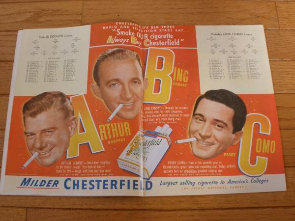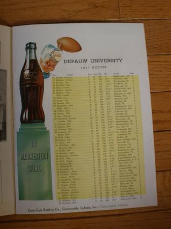 For sale is a variety of DIFFERENT 1940s DEPAUW UNIVERSITY FOOTBALL PROGRAMS. Each glossy program has a full color cover which depicts a great football themed cover from the leatherheads era. Each program is about 15-pages program. Programs vary in condition but are complete. Each program features player photos, team rosters, a variety of ads from local businesses, great full color Chesterfield cigarettes advert. The bottom of a Philip Morris ad features a tutorial on the referee signals for the various penalties. Each program originally sold for 25 cents. A great sports collectible from the leatherheads era of football.
