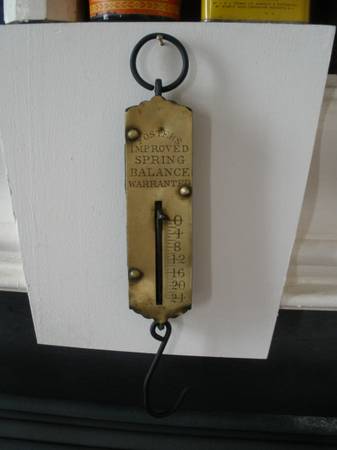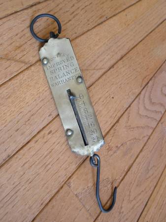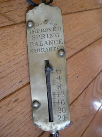For sale is an antique FOSTERS IMPROVED SPRING BALANCE. This 24-pound capacity Iron Clad Spring Scale with a shiny brass gauge and maker’s mark. This warranted scale measures approximately 5 inches long and 1 1/2 inches wide. Accuracy is unknown but scale still works as intended. A nice collectible mercantile scale.