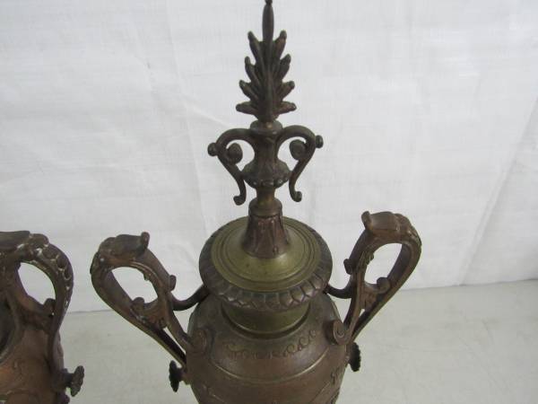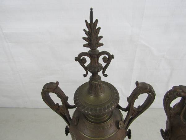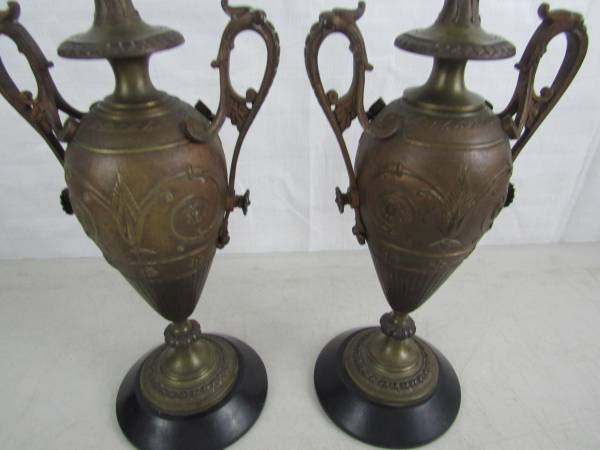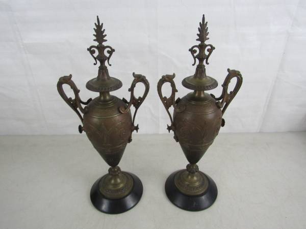 The Garnitures are 13 1/2" tall, and 3 pounds 6 ounces each. Made of brass/bronze mounted on a slate pedestal. Not sure if they were to be used as urns. Good condition with some age and usage wear. The most noticeable issue is there is chips in the slate pedestal on the bottom sides.