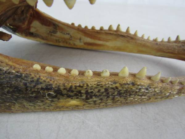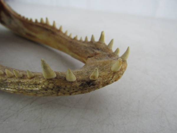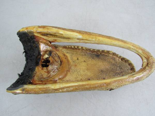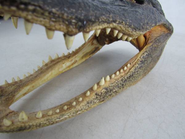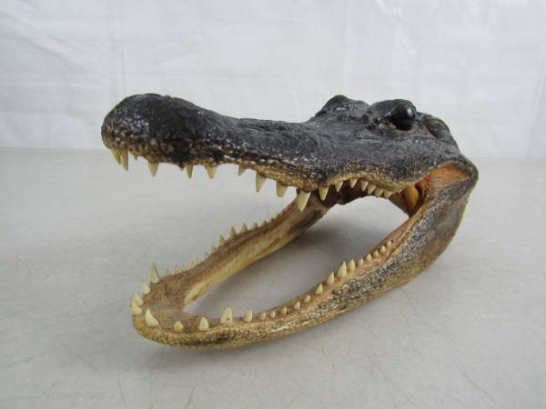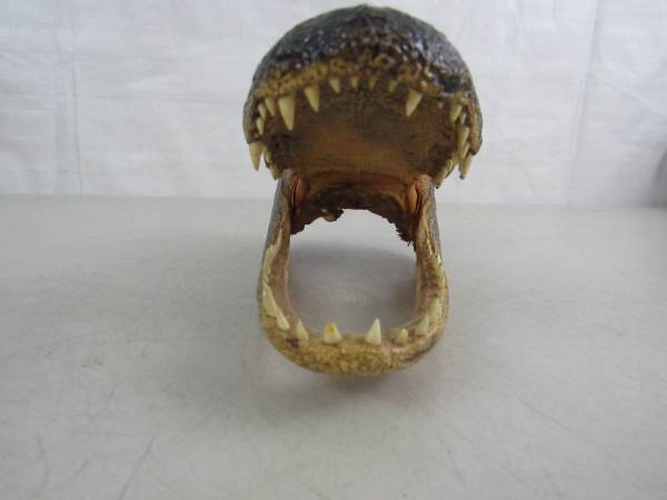 The Alligator head is 8 1/2" length. The head, jaws, and eyes are taxidermy, and the teeth are real. Good condition with some minor age and usage wear. See photo's