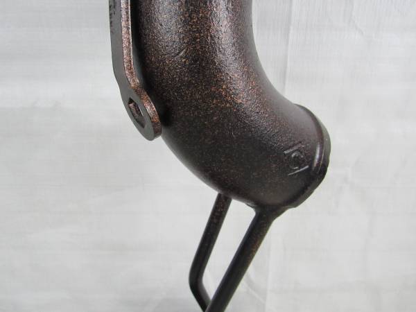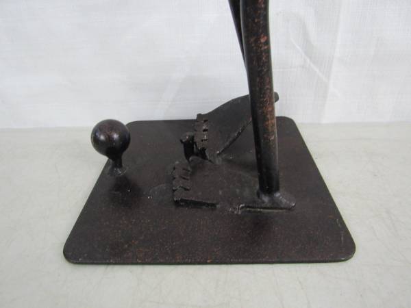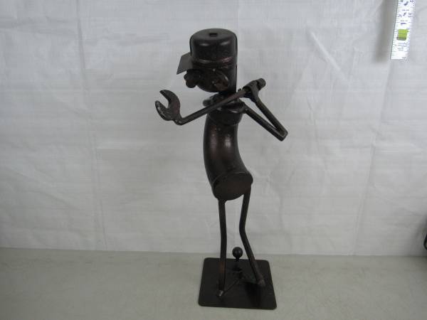 The Golfer putting sculpture is 19 3/4" height, and weighs 9 pounds 3 ounces. Made of scrap steel and iron with a bronze tone finish. The golfer's necktie is made from a vintage Black & Decker spanner wrench. Very good condition. No broken or missing parts.