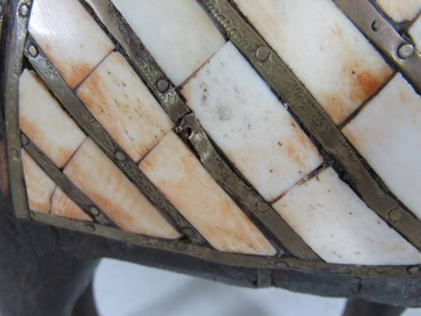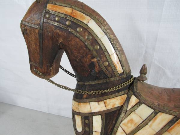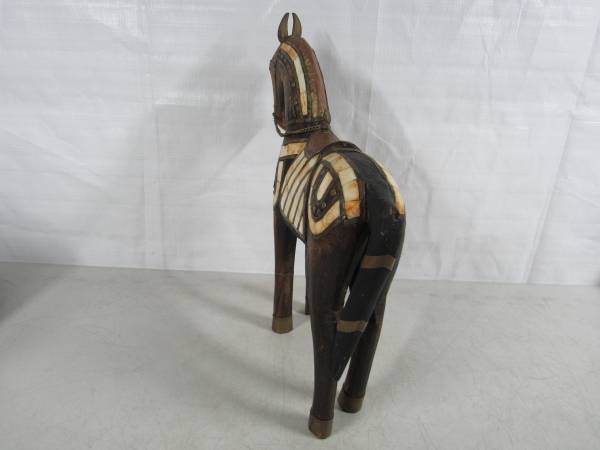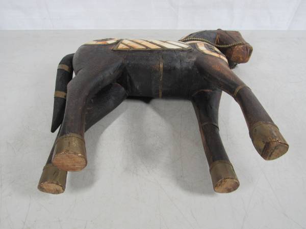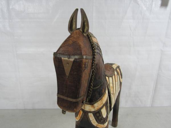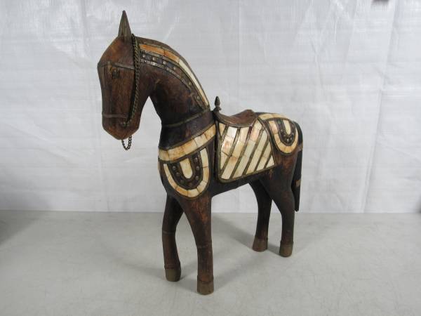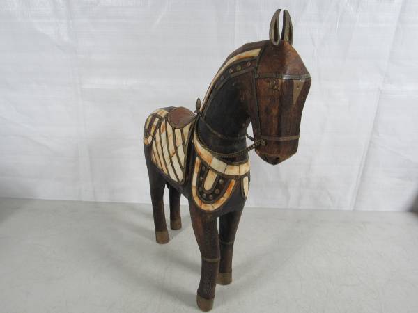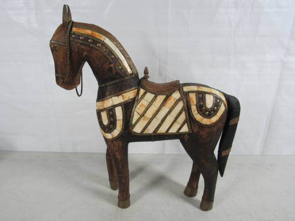 The Horse is 15" height X 13" length X 3" width. Made of hand crafted wood with brass accents. Weighs 3 pounds 7 ounces. Good condition. There is one brass strip on the right side saddle that is...