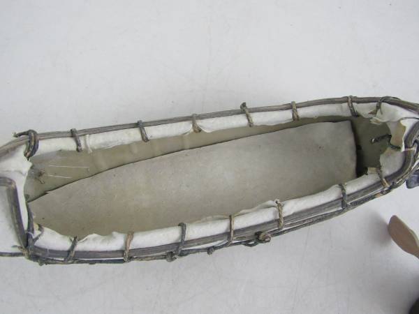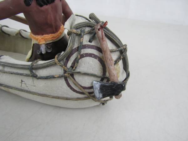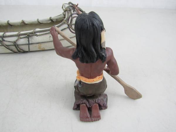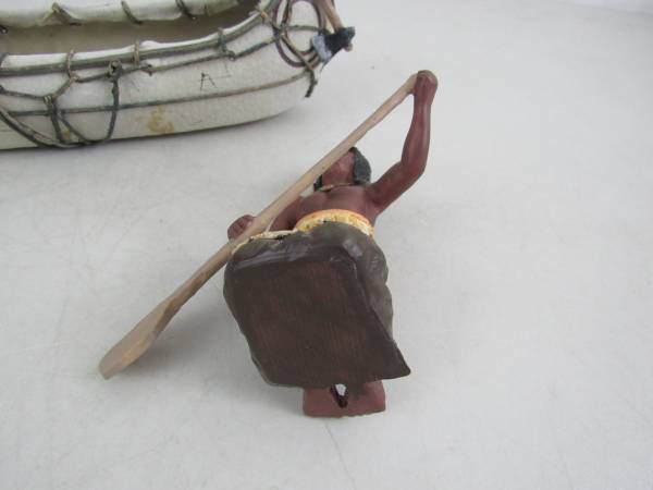 The canoe is 10" length approximately. Canoe is covered in suede/leather, and the canoe made of an epoxy type material. The Indian is made of resin type epoxy material. Good condition with some stains and age wear. No broken or missing parts.