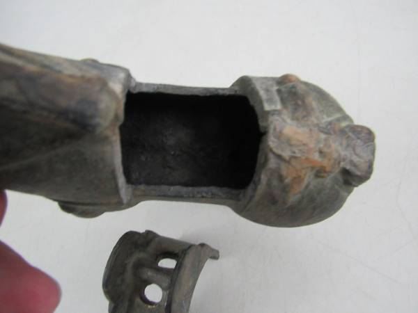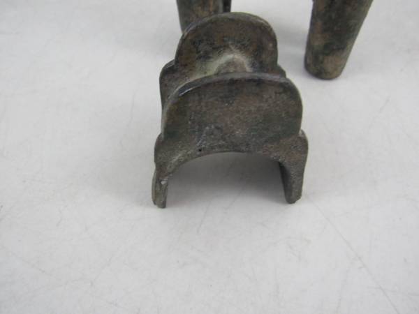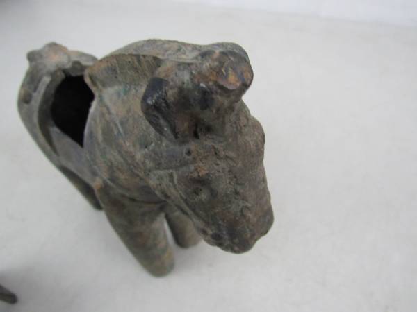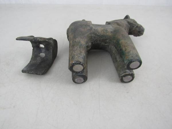 The vintage haniwa horse is 6 3/8" length X 6 1/2" height X 2 1/4" width, and weighs just over 4 pounds 5 ounces. Made of cast iron with a gilt tone finish that has faded over the years. Good vintage condition with typical age and usage wear. No broken or missing parts.