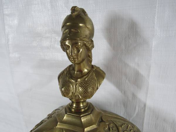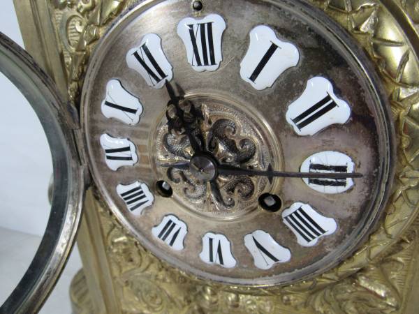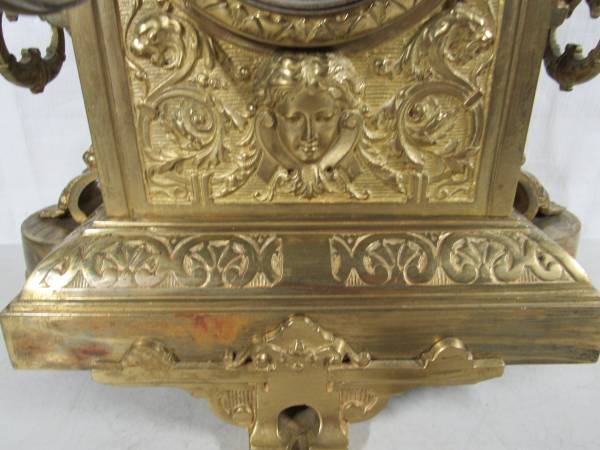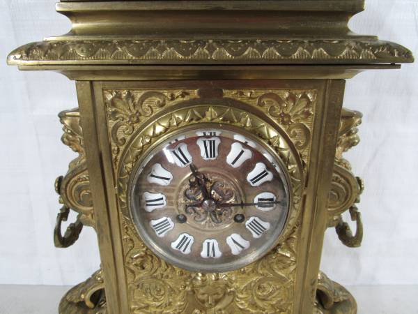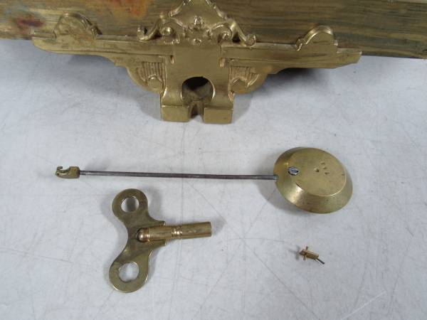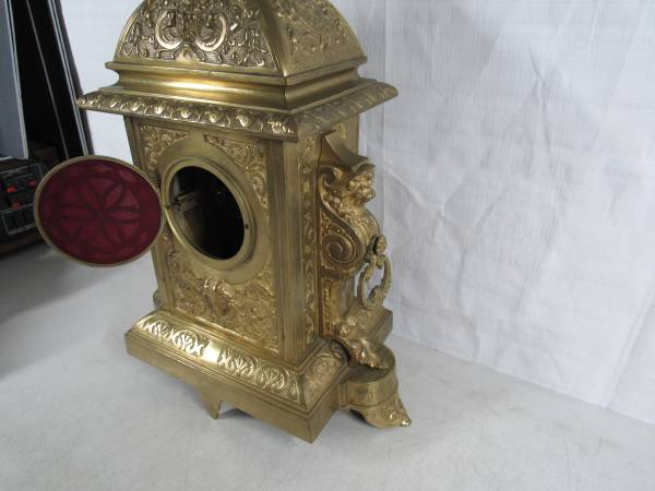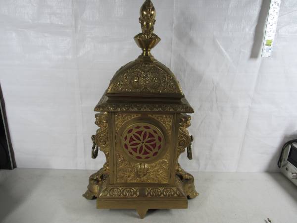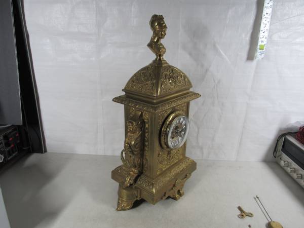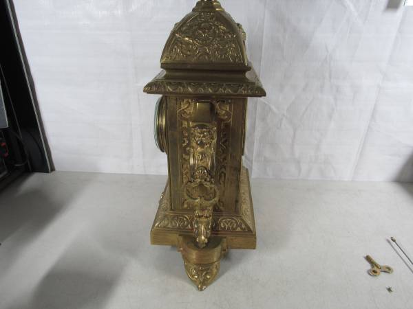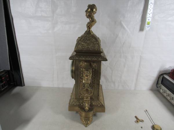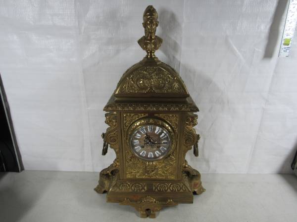The clock is 23 1/2" height X 15 1/2" width X 8 3/4" depth. Made of solid brass and weighs 30 pounds 8 ounces. The clock is not working at this time. Moving the hands manually the chime hammer will hit the chime, but will need to be adjust for it to strike in the correct spot on the chimes. The small retainer that holds the pendulum in place is broken. Good cosmetic condition.