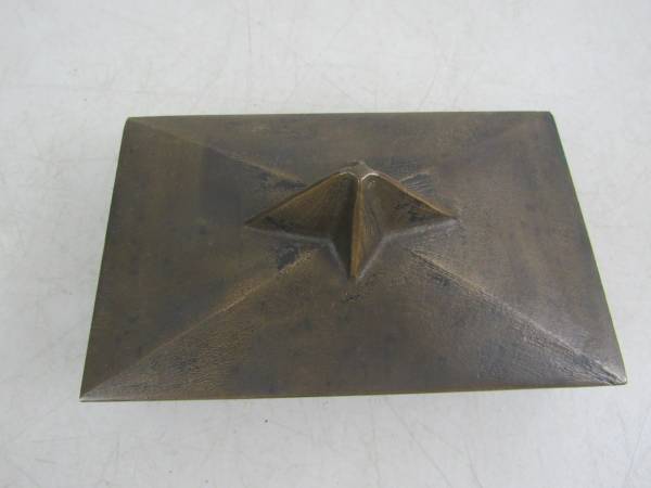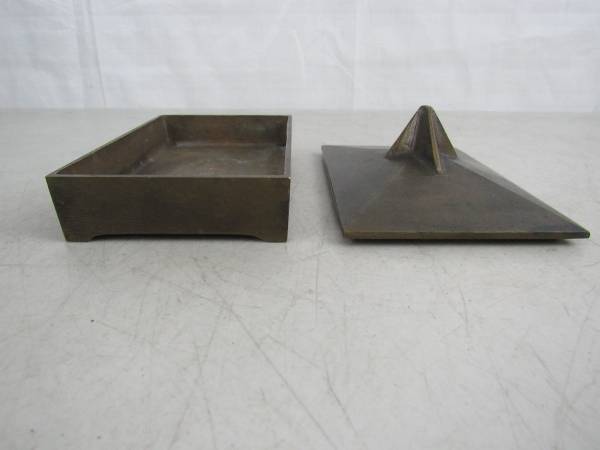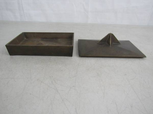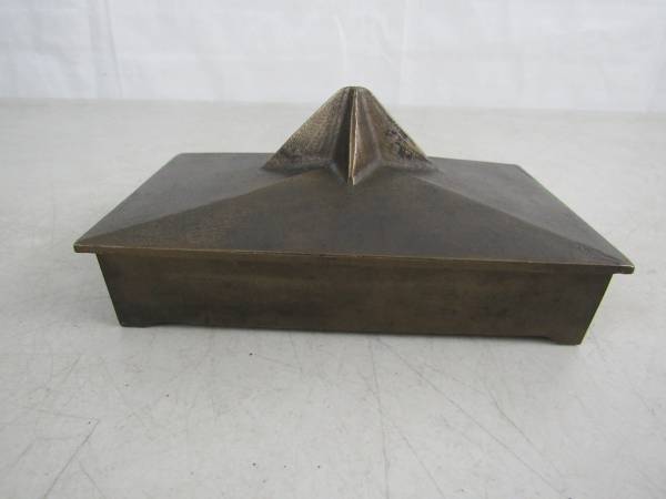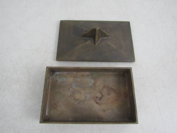 The brass box is 6" length X 3 1/2" depth X 2 3/4" height. made of solid brass, ans weighs 2 pound 12 ounces. There is dates of 1854 Kugler 1964 stamped on the inside, and I am not sure what that is for. Good condition with some typical age discoloration. No broken or missing parts.