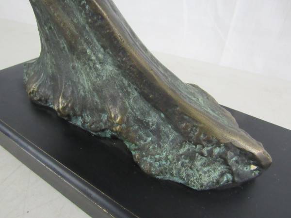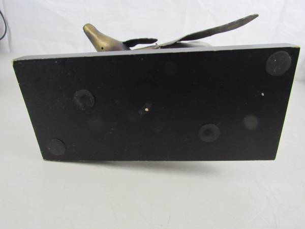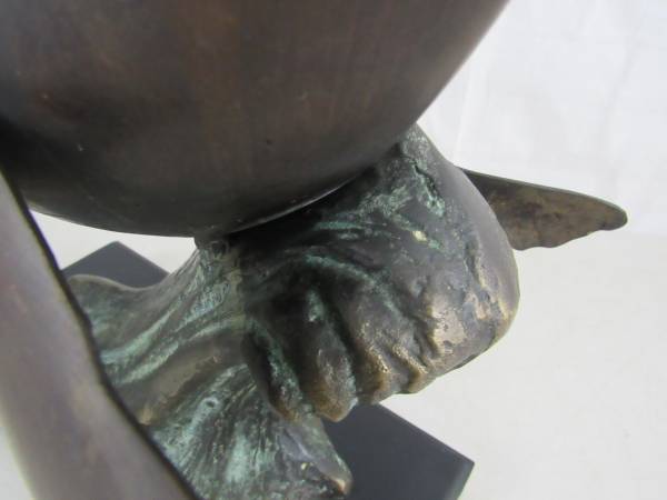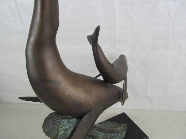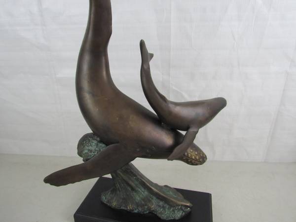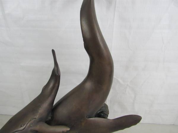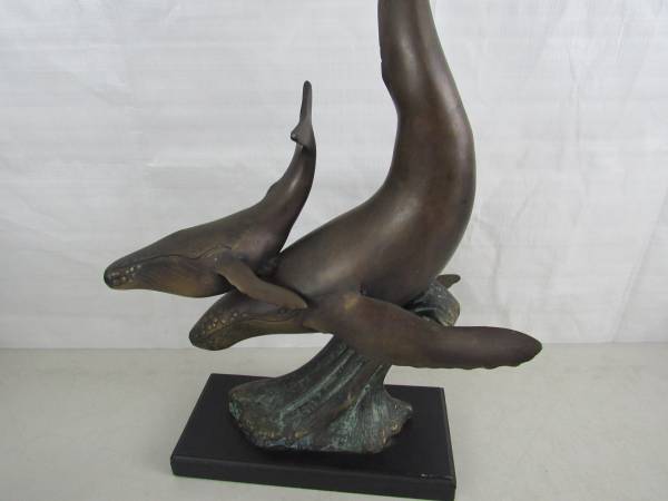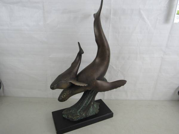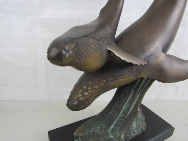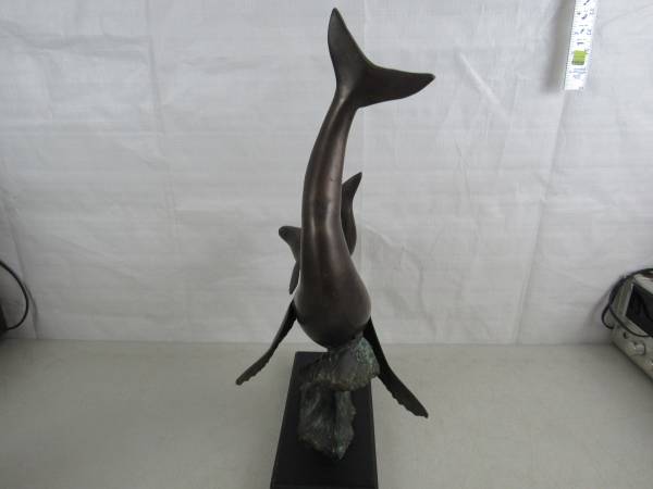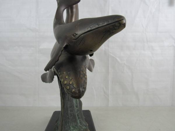 The whale statue is 21 1//2" height X 12 7/8" length X 8" pectoral fins width, and weighs 9 pounds approximately. Made of solid brass that has age discoloration to a bronze tone, and the base is made of wood. Hollow inside. Good condition with some minor age and usage wear. No broken or missing parts.