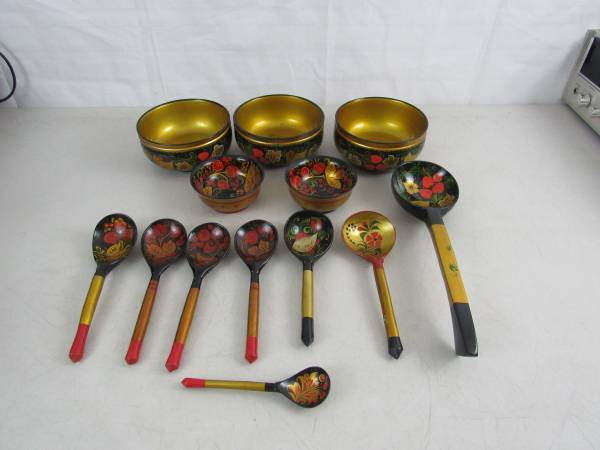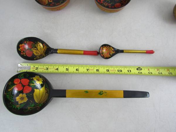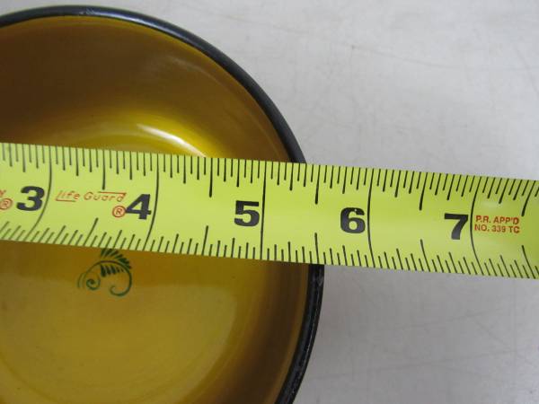 The large bowls are 5 3/4" diameter X 2 5/8" height. The smaller bowls are 4" diameter X 1 3/4" height.The set is in good condition with some minor age and usage wear. See photo's