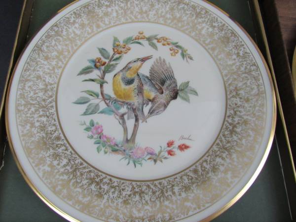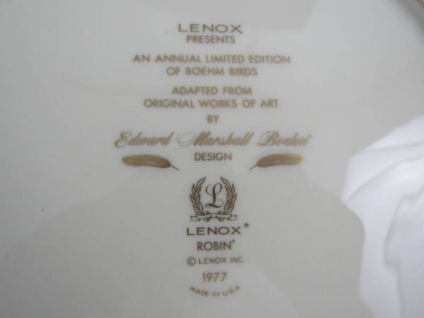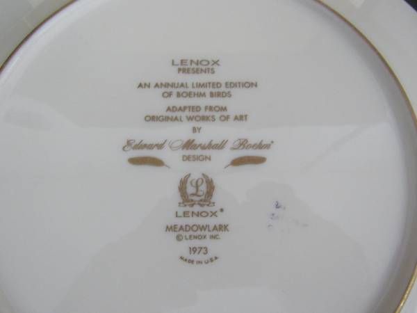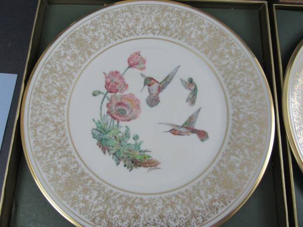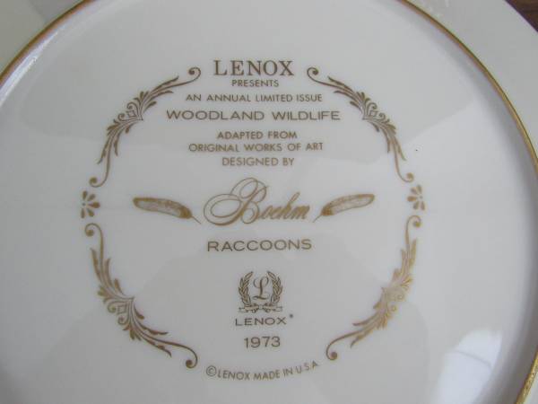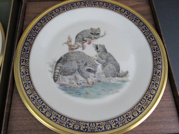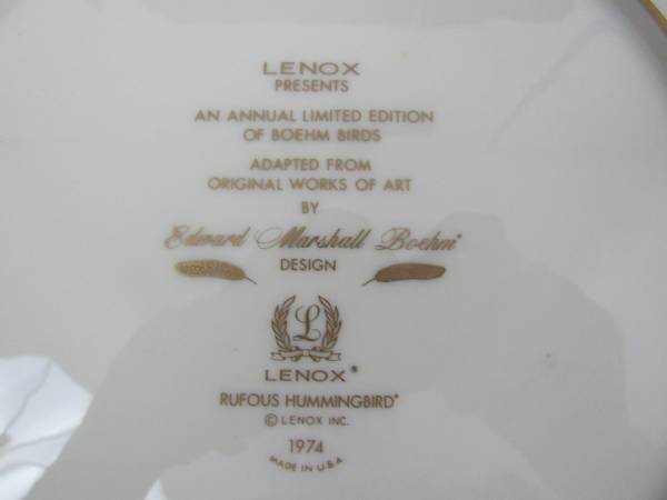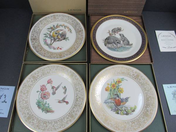 Each plate is 10 3/4" diameter with 24 karat Gold trimmed Lenox China. All plated were designed by Edward Marshall Boehm. The plates are in very good like new condition. Not sure if they were ever displayed outside of box. Set includes Raccoons 1973, Meadowlark 1973, Rufous Hummingbird 1974, Robin 1977. The COA's are included except for the Meadow lark plate. Comes in the original boxes which have some minor age and storage wear. No broken or missing parts except the COA mentioned above.