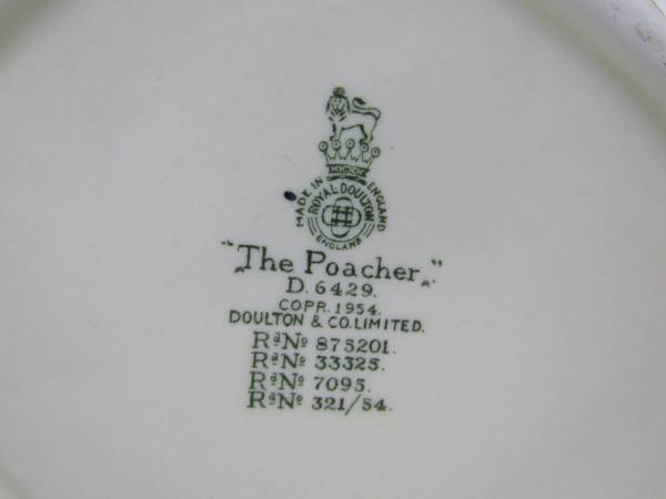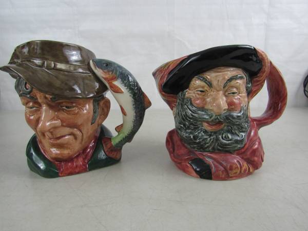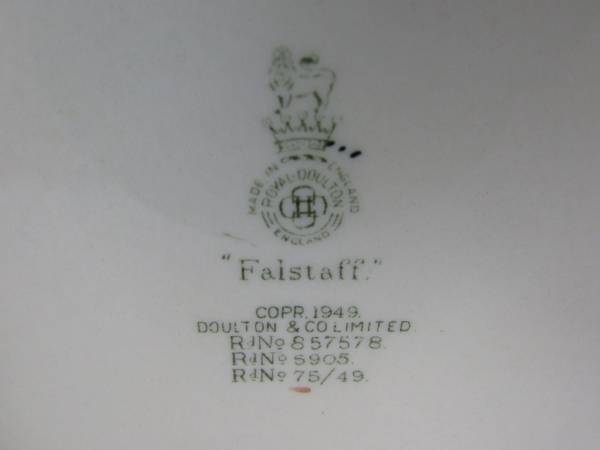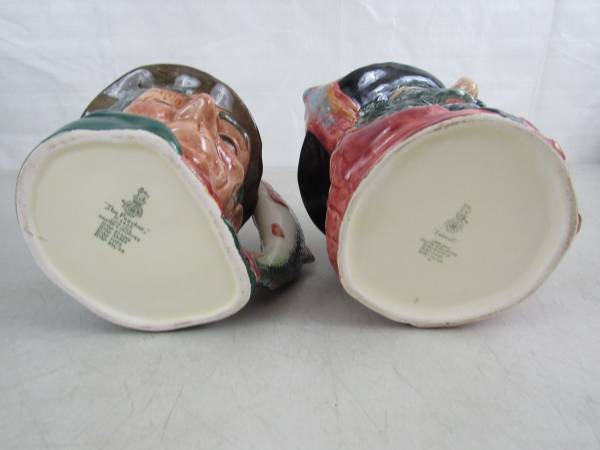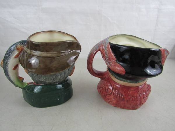 The Poacher 6 1/2" height X 4 5/8" diameter and dated 1954, and the Falstaff mug is 6 1/4" height 5 1/2" diameter at it's widest point, and dated 1949. Made of ceramic, and manufactured in England. Good condition. No chips,cracks, broken or missing parts. Only some minor usage wear on the bottom sides of both mugs. Used as display items only.