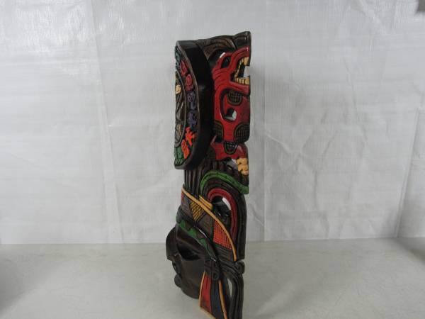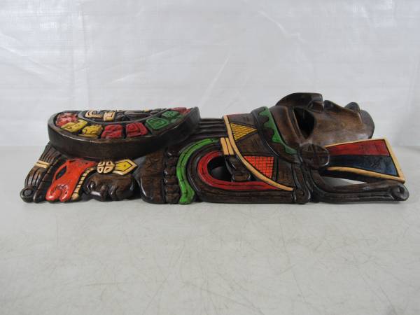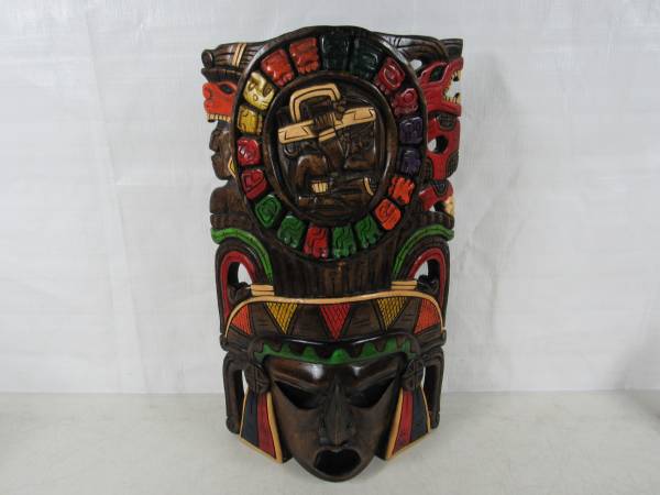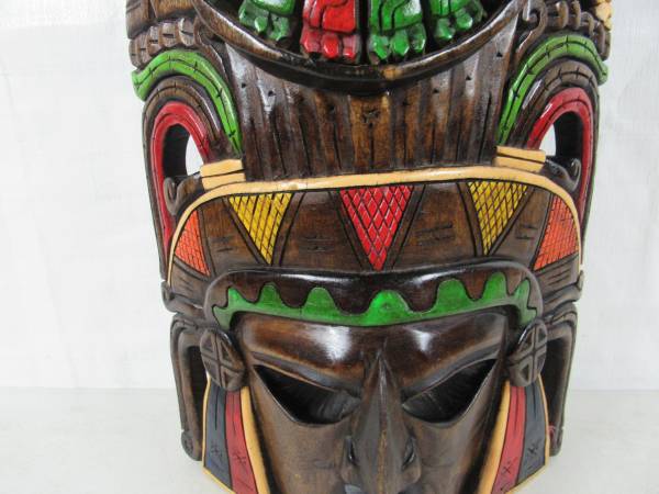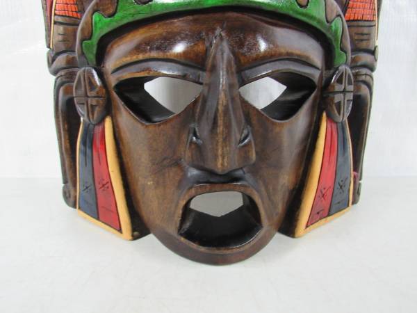 The Mayan Aztec mask is 15 3/4" height X 9 3/8" width. Made of hand carved wood, and hand painted. Excellent condition. No broken or missing parts. See photos