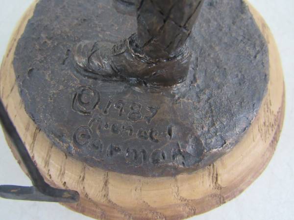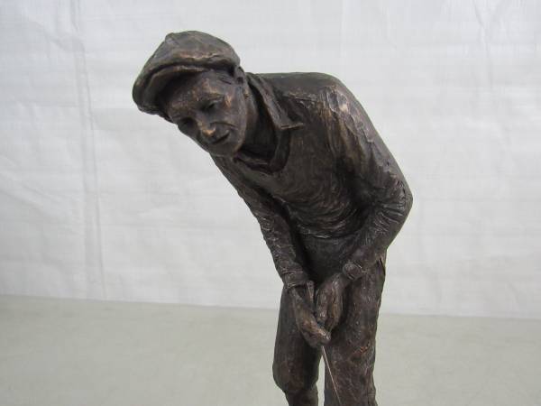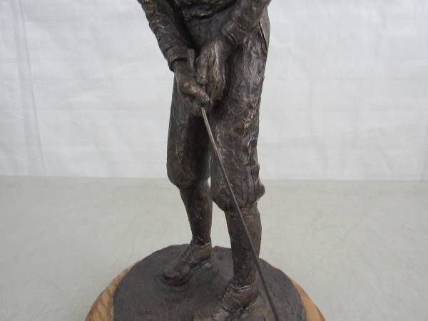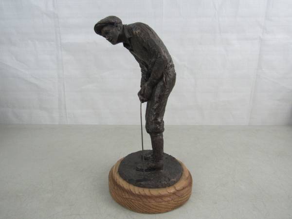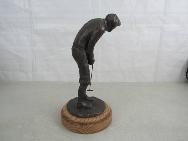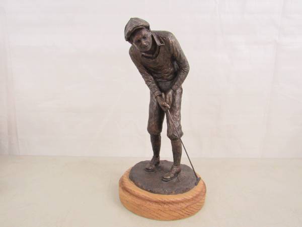The Golfer sculpture is 11" tall, and weighs 3 pounds 10 ounces. Made of an epoxy type cast materiel with a bronze tone finish. Manufactured in 1987 by Michael Garman and is numbered #087. Very good...