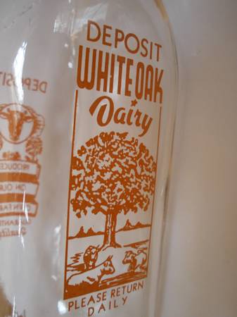 This milk bottle is in excellent condition with red lettering that reads: "DEPOSIT WHITE OAK DAIRY - PLEASE RETURN DAILY" and on the other side "DEPOSIT PRODUCED ON OUR OWN FARM GUARANTEED QUALITY". The bottle is marked "3" on the bottom. Bottle measures 8 3/4 inches tall and 3 1/4 inches diameter. A great addition to your milk bottle collection!
