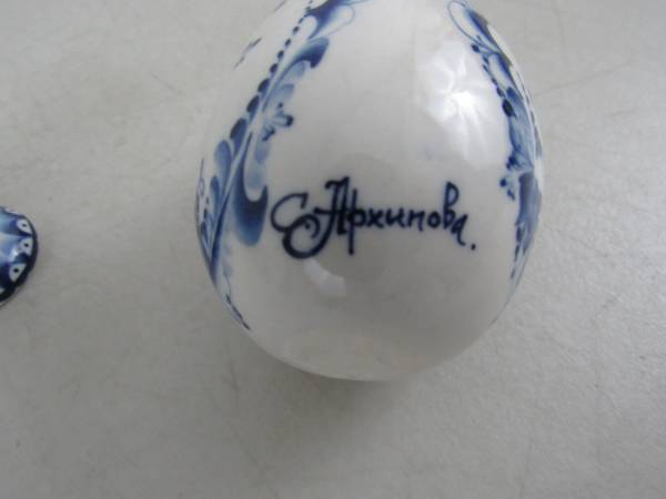 The egg is 3" tall without stand. made of ceramic or porcelain, and signed by S. Arkhipova. Good condition with some minor crazing. No cracks or chips. See photo's