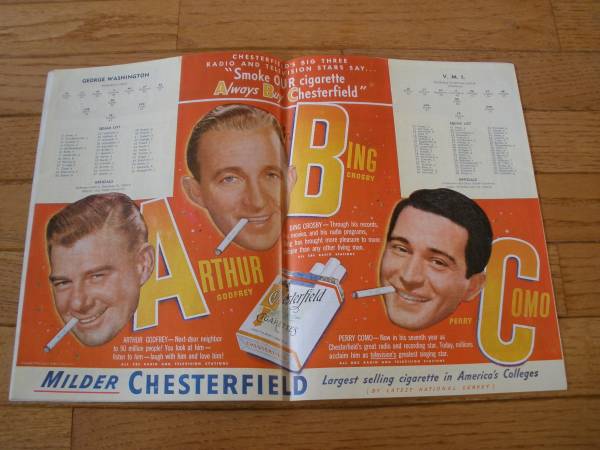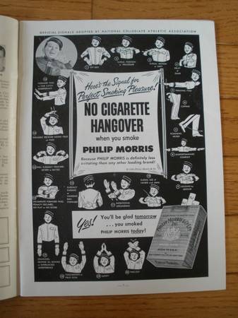 For sale is an ORIGINAL 1949 GEORGE WASHINGTON v VMI FOOTBALL PROGRAM. The cover of this Virginia Military Institute Football Program depicts a silhouette of an Eagle melding into the American flag from the leatherhead football era. This 31-page program is complete and in very good condition with no torn pages. The original owner recorded the game score on the front of the program (VMI prevailed with a score of 14 to 7). The program features a team photo and photos of several players who quite honestly lack an athletic build. The program also features lots of great ads to include full color a Bing Crosby Chesterfield Cigarette Ad; a Camels Cigarettes' Ad; and an ad for the 1948 Kaiser Traveler Auto which sold new for $2,088. Purchase it for the VMI grad in your family.