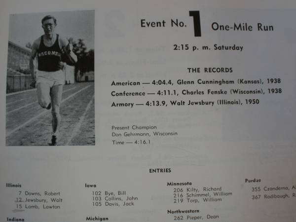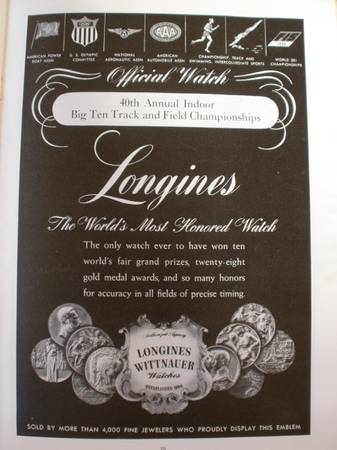 For sale is an ORIGINAL 1950 40th ANNUAL BIG TEN TRACK & FIELD CHAMPIONSHIP PROGRAM. The full color cover of this glossary program depicts a sprinter and a stopwatch. The program was printed for a college track meet that occurred in Chicago on March 3 and 4, 1950. This 26-page program is complete and in good condition but some of the interior pages have some pencil notations. The program contents features team rosters for the competing Universities (Illinois, Iowa, Michigan, Minnesota, Northwestern, Ohio State, Purdue, Wisconsin, and Indiana). The program has coach and athlete photos, a variety of ads from local businesses and a Gregory Peck Chesterfield cigarette advert. The program also includes track records which were in effect at the time of the meet. For example, the record time for the one-mile event was 4:04. The program original sold for 25 cents. A great sports collectible.