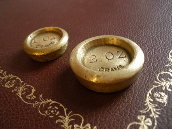 For sale is a pair of BRASS CRANE SCALE PANCAKE WEIGHTS from Crane Foundry, Wolverhampton, United Kingdom. One weight is a one-ounce weight and the other is a two-ounce weight that nest together. The larger weight measures about 1 3/8 inches diameter.