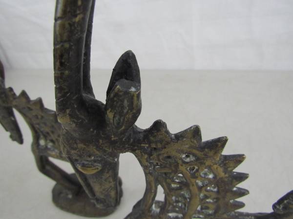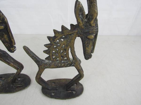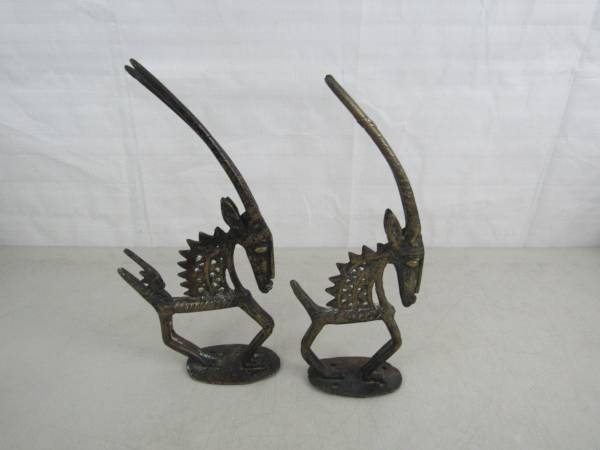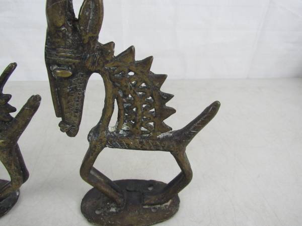 The figurines are 12 3/4" height, and the shorter one is 12" height X 6" length for the taller one , and 4 15/16" for the smaller one. The taller one weighs just over two pounds, and the smaller one is just under two pounds. The larger one has 1/4" chip in top of it's left ear. Good condition with some age and usage wear.