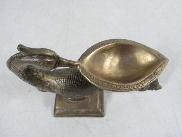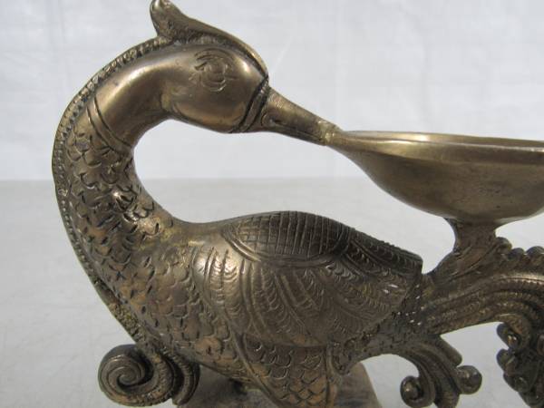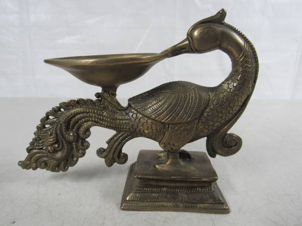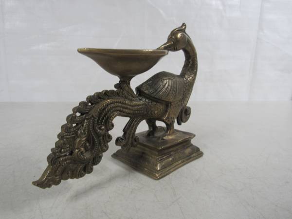 The Peacock oil lamp incense burner is 6 1/2" length X 5" height X 2 3/8" base depth. Made of solid brass and weighs 1 pound 14 ounces. Very good condition with some minor usage wear. No broken or...