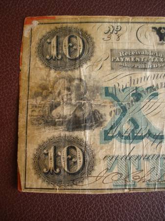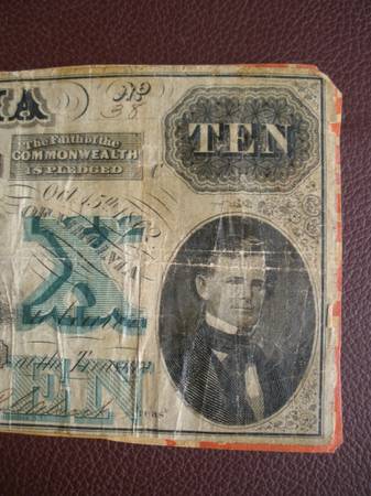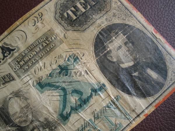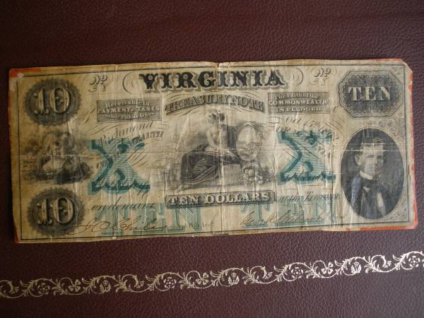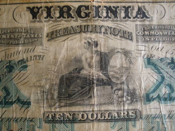 For sale is a rare 1862 $10 VIRGINIA TREASURY NOTE from Richmond, Virginia. This obsolete currency note is in very fine condition. The note has a low serial number of 38. The 1862 currency note features a portrait of Governor John B. Floyd on the right side of the note; a graphic of a shield with Thor's image; and a depiction of a seated Prosperity with a cornucopia. The note was issued on October 15, 1862. The note is hand signed. This civil war era currency note measures about 3 1/8 inches by 7 1/2 inches. A top notch historic collectible.