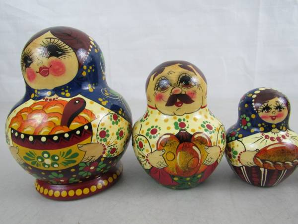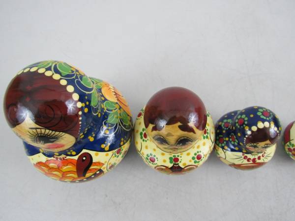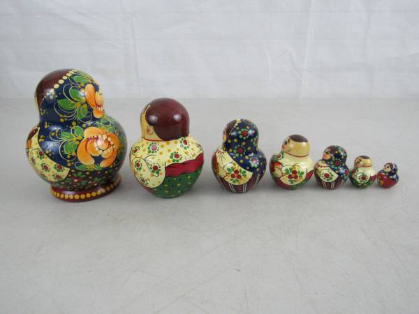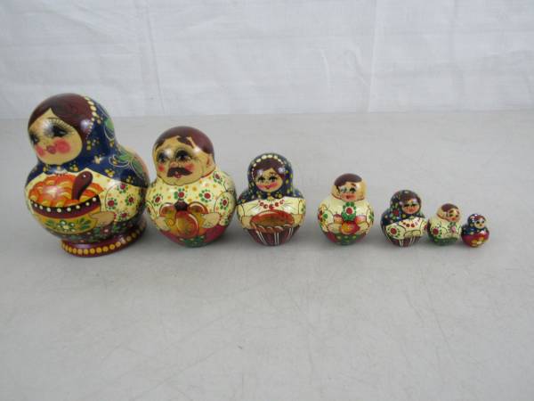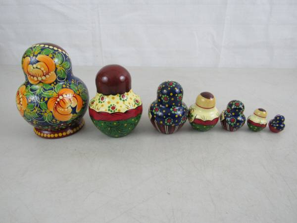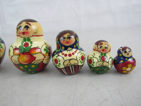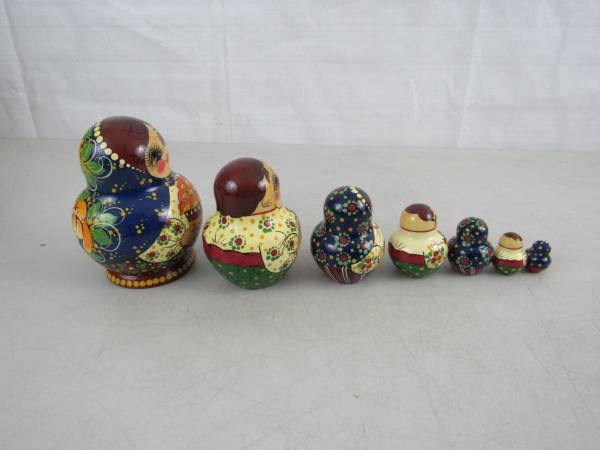 The nesting dolls are 1" up to 4 3/4". Made of Russian Birchwood. Good condition with the largest doll has a pinhead size paint chip on the backside. No broken or missing parts. See photo's