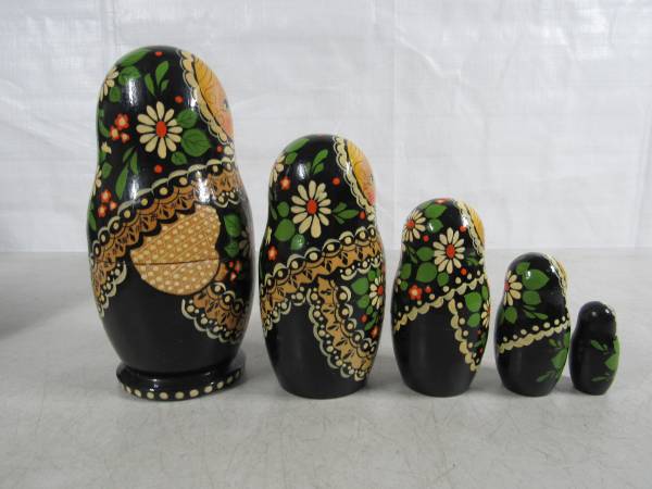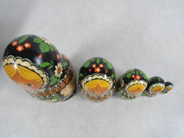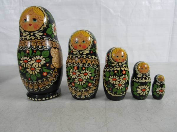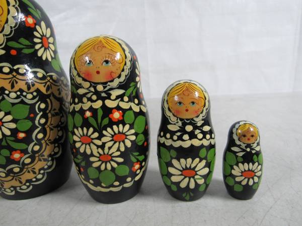 The Matryoshka dolls are 1 3/4" up to 6 1/2" tall. Made of authentic Russian Birchwood. Very good condition. No broken or missing parts. See photos
