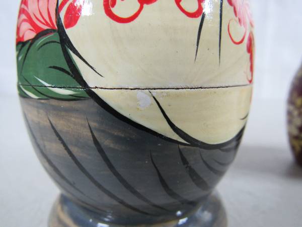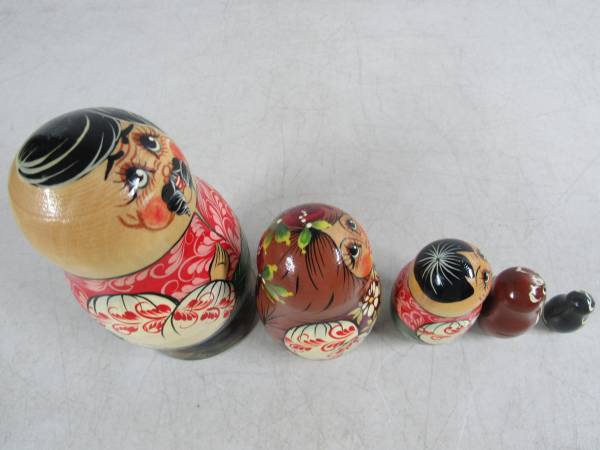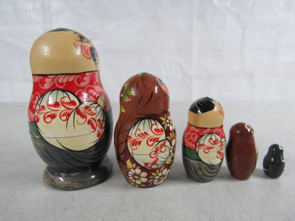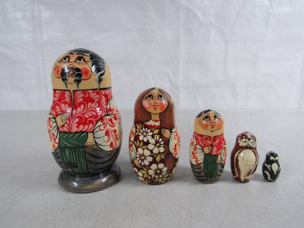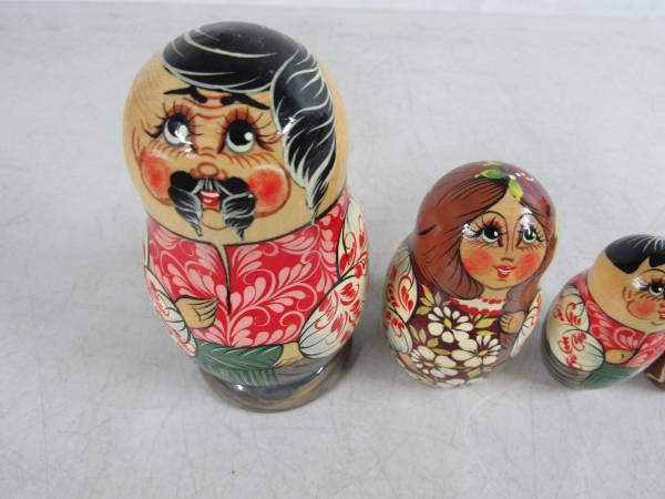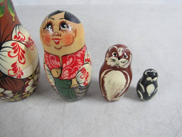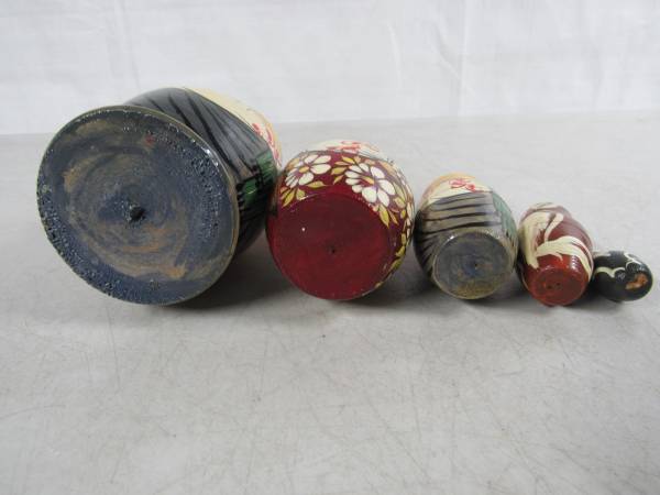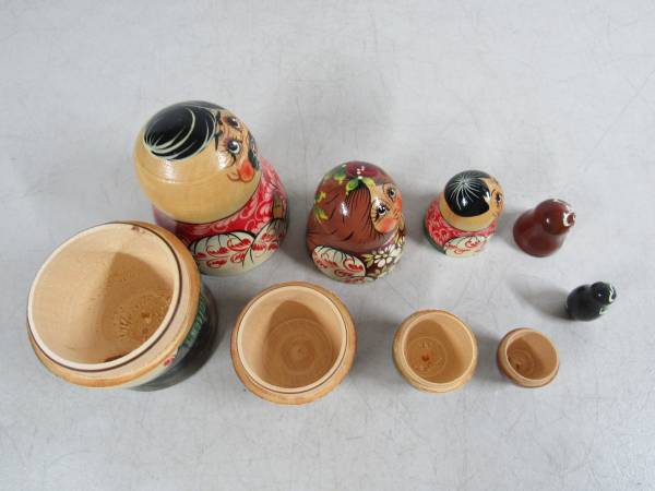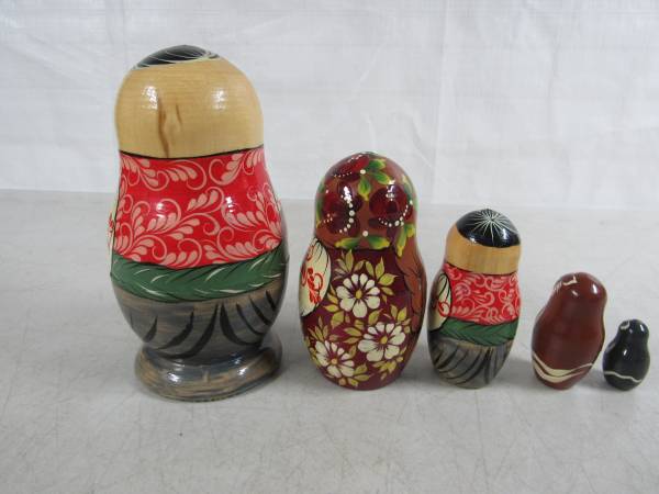 The nesting dolls are 1 1/4" up to 5 3/8". Made of Russian Birchwood. Very good condition. No broken or missing parts. See photos