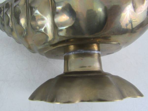 The planter is made of solid brass, and is 7 3/4" length X 6 1/4" height X 3 3/4" width X 3" across the opening at the top at it's widest point approximately. Weighs 2 pounds approximately when empty. Good condition with some minor age and usage wear.No broken or missing parts.