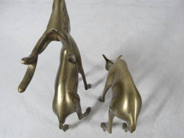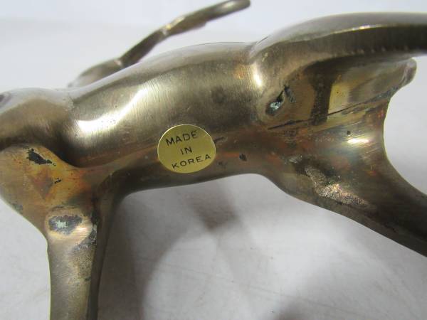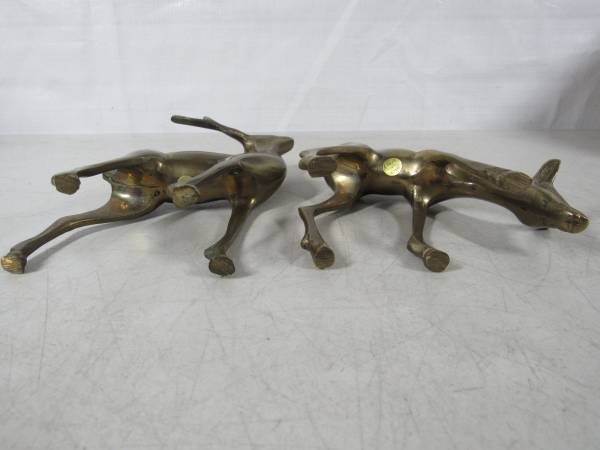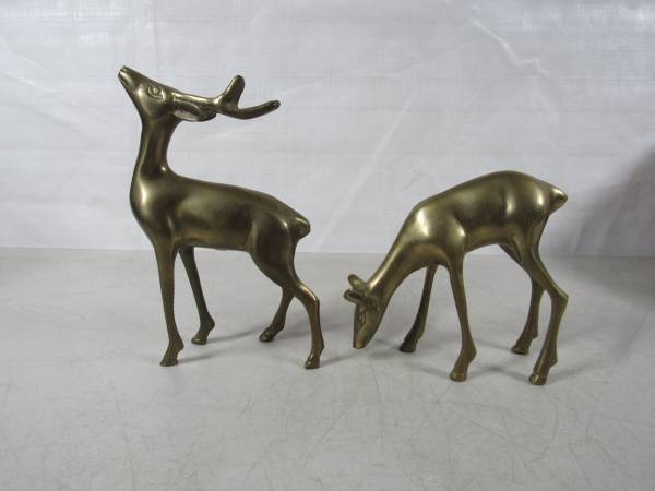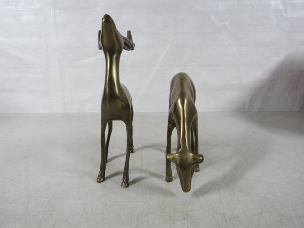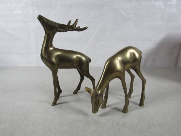 The Stag is 6 1/2" height X 4 1/2" length, and the Doe is 4 1/2" height 5" length. Made of solid brass, and both are hollow on the inside. Good condition with some age and usage wear. No broken or...