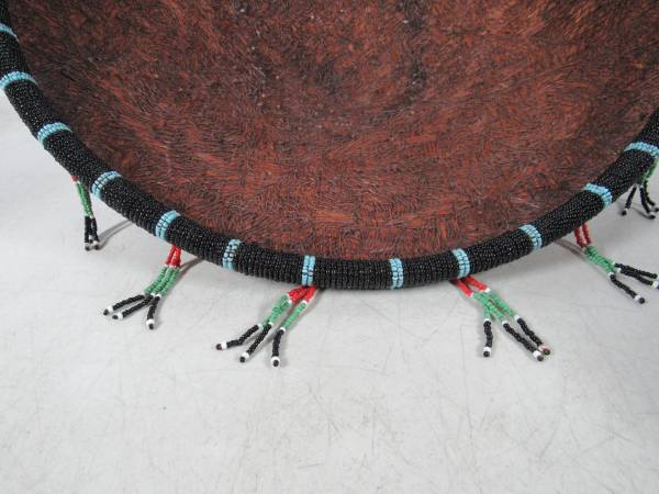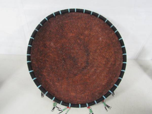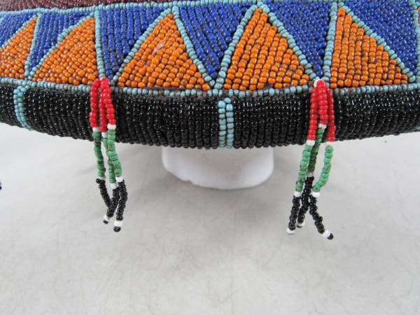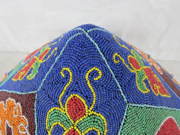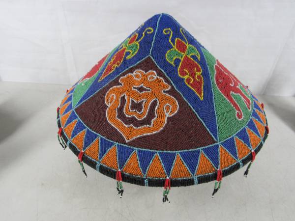 The hat is 8" height X 16 1/8" diameter at it's widest point. The hand is possibly made of hand woven bamboo frame, palm leaves and trade cloth with seeded bead decoration. Excellent condition. See...