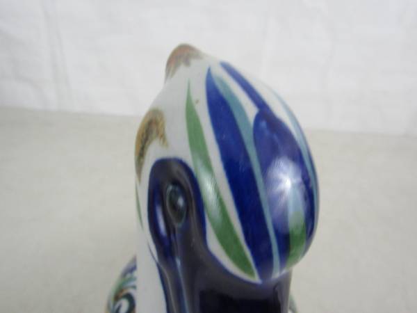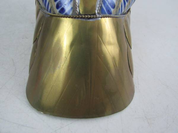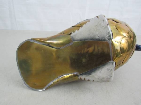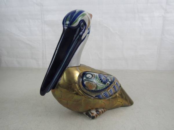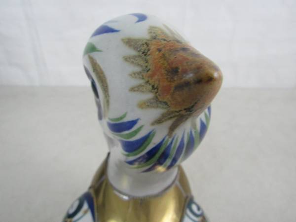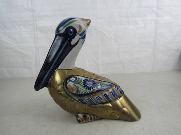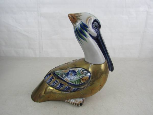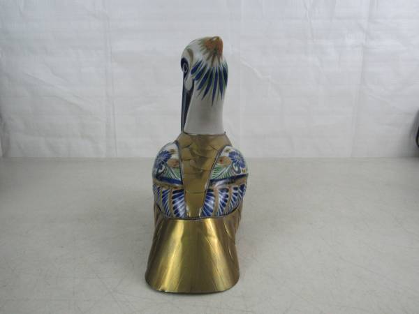 The statue is 10" length X 9 1/2" height X 4 1/2" width, and weighs 2 pounds 7 ounces. The gold colored section is brass, and the rest is hand painted ceramic. Good condition with some minor age and usage wear. No broken or missing parts.