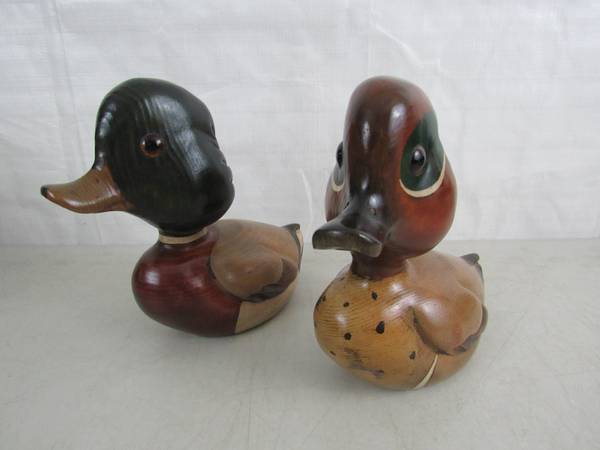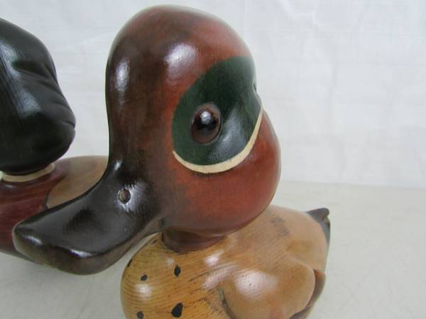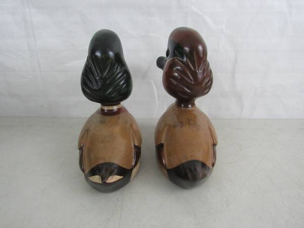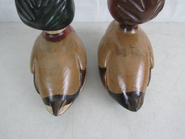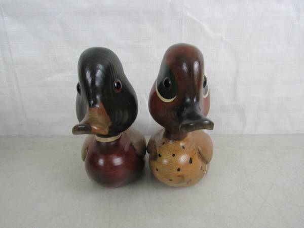 The Ducks are 8 1/8" height X 8 5/8" length X 3 3/4" body width, and weigh one pound each. Made of wood with a glossy finish. Good condition with some minor age and usage wear. No broken or missing...