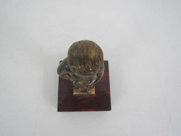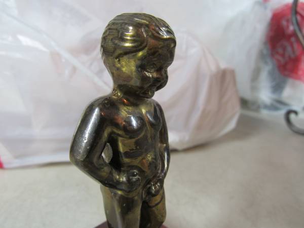 The boy figure with base is 4 1/2" tall approximately and weighs just under a pound. The figure is solid brass, and the base is marble. Good condition with some age, usage wear, and there is a 3/8" scratch line in the marble base at the back left corner area.