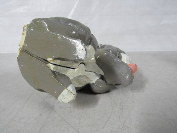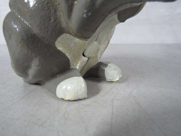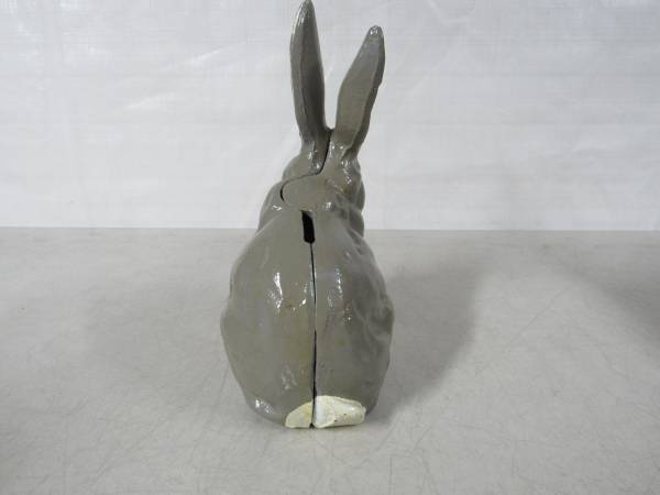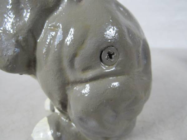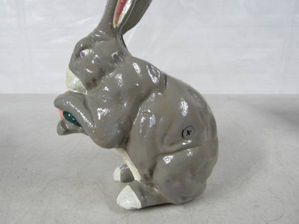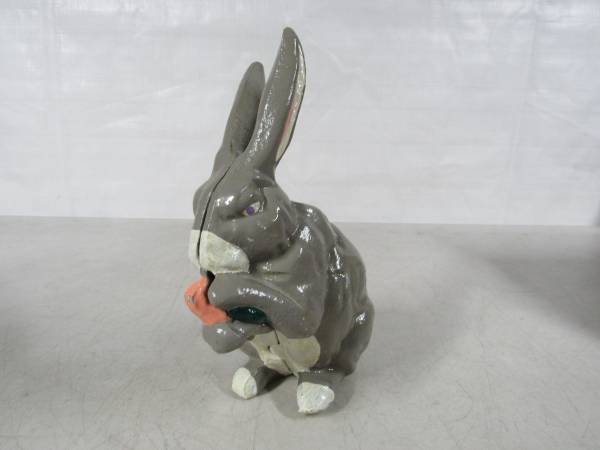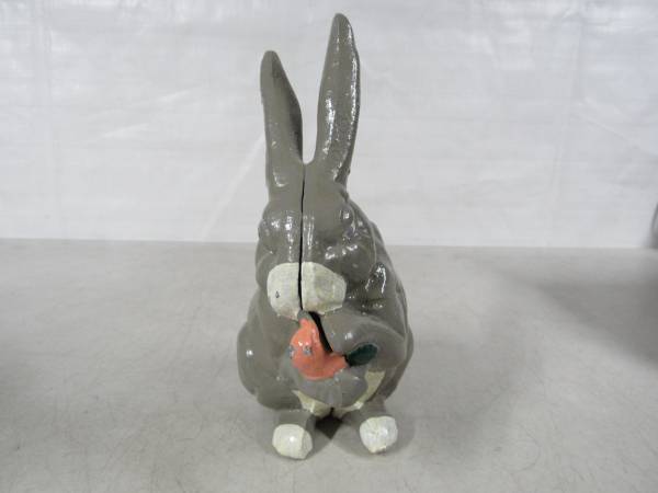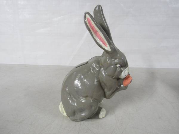 The Rabbit coin bank is 7 1/4" height X 4 3/4" length X 3 1/4 width. Made of cast iron and weighs 3 pounds 3 ounces. The coin slot will fit US nickles or small diameter coins. Very good condition with some minor paint wear. No broken or missing parts.