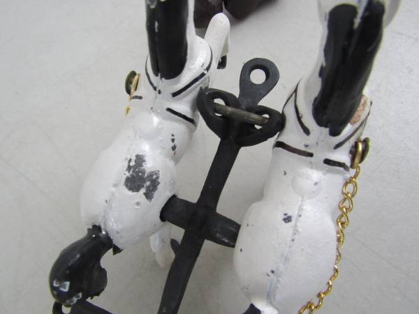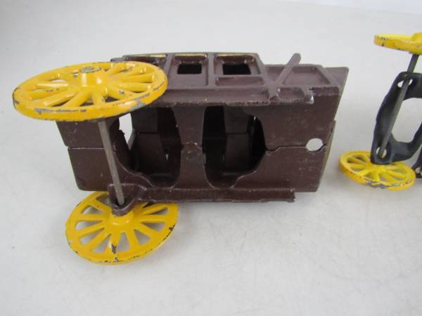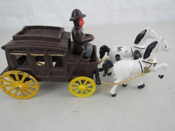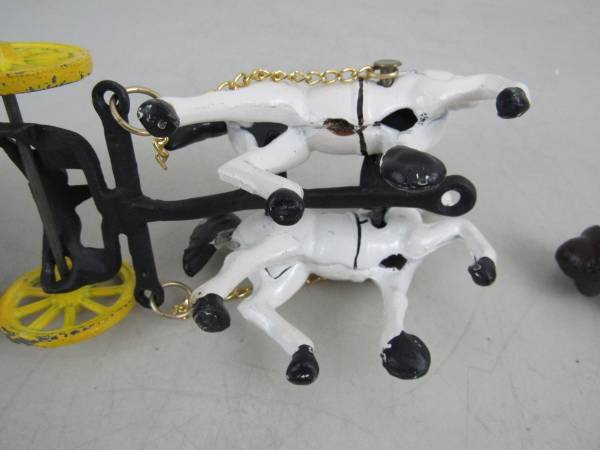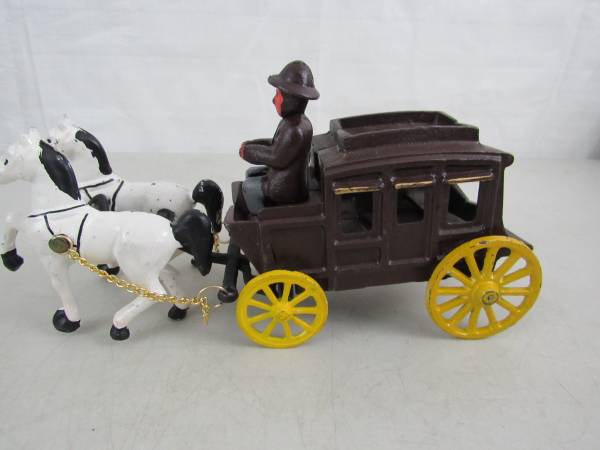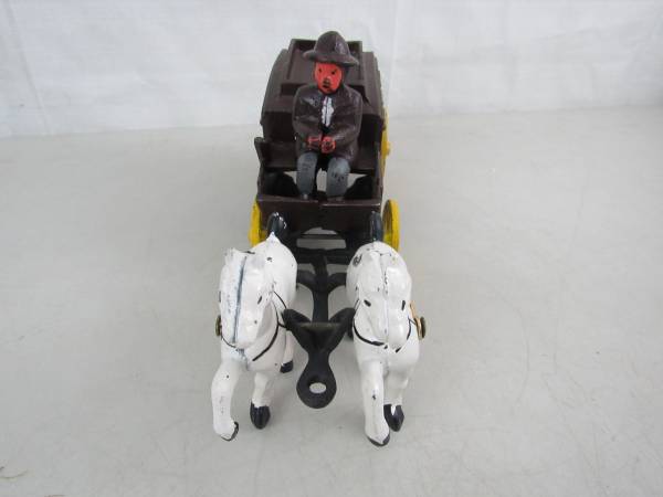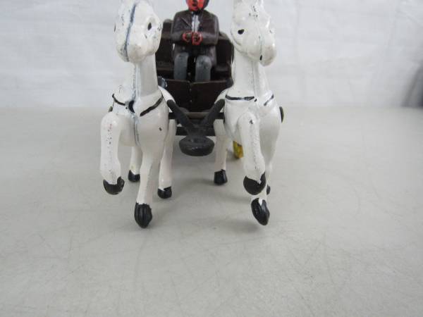 The horse drawn wagon is 10 1/2" length X 5 1/4" height X 3 1/8" wheel base width. Made of cast iron and weighs 3 pounds 9 ounces.. Fair condition with some age and usage scratches, scuffs, and...