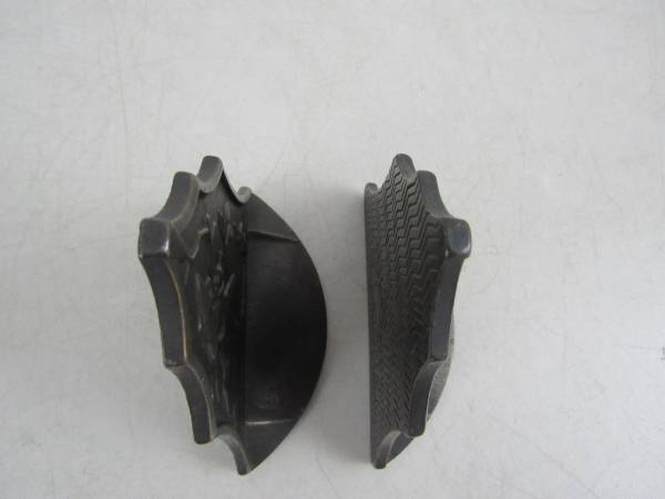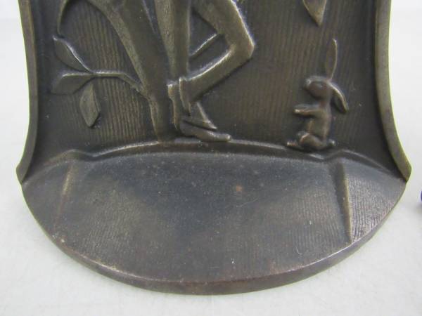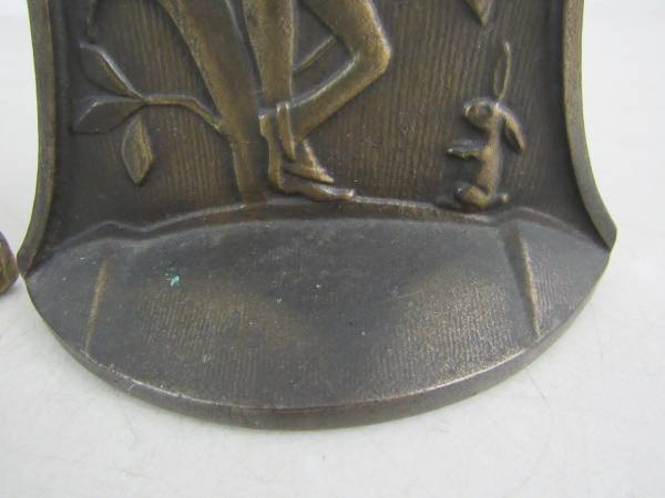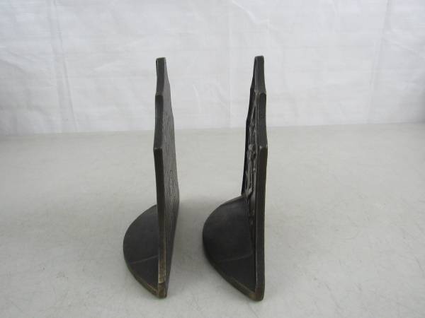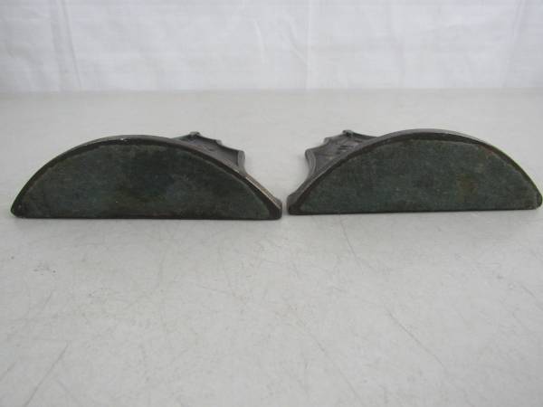 The bookends are 5 3/4" height X 5 1/4" base width X 1 5/8" base width, and weighs 2.5 pounds together approximately. Good condition with some minor and usage wear. No broken or missing parts. See...