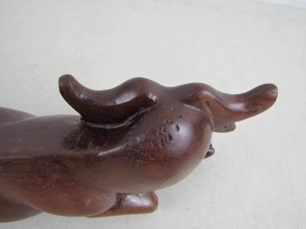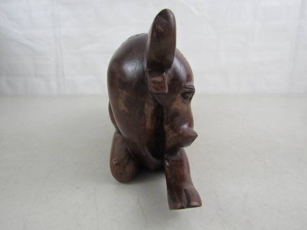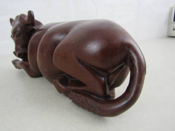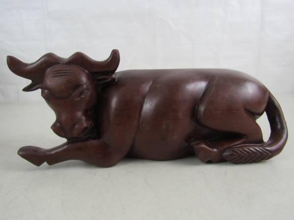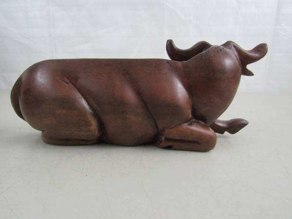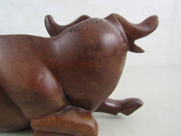The Bull is 11 1/2" length X 4 3/8" height X 3" width approximately, and weighs 2 pounds 5 ounces approximately. Made of a solid hard wood. There is a 3/4" section of the tail that was broken and glued back in place. Good condition with everything else with some age and usage wear.
