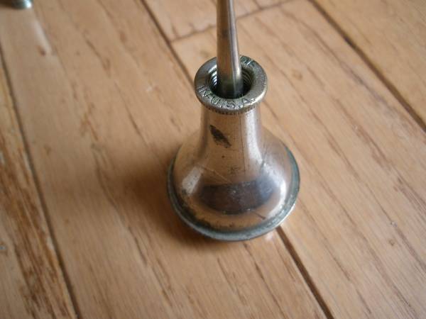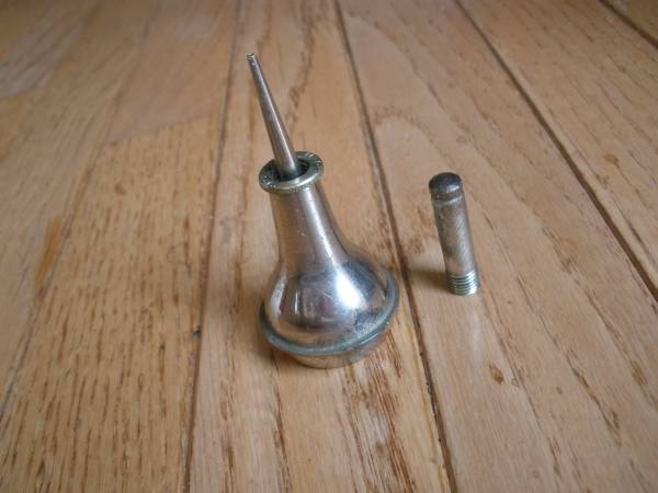For sale is a vintage MINATURE PRECISION POCKET SIZE OILER for fishing reels, gun, or typewriter lubrication. The top is marked "Made in USA". The oiler has a rounded bottom which narrows to the top with a stopper. The oiler is used by pumping the bottom with your thumb to release the oil drops. The oiler is made of chromium plated brass and measures slightly more then 3 inches tall with a 1 1/2 inch diameter bottom. A great collectible oiler.