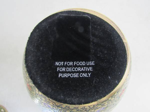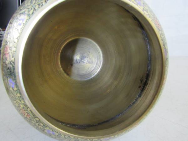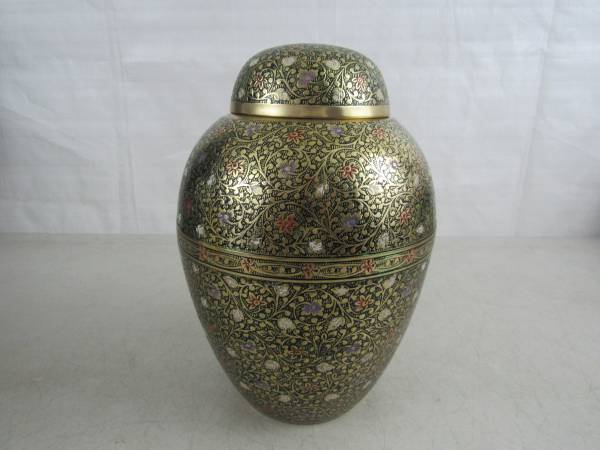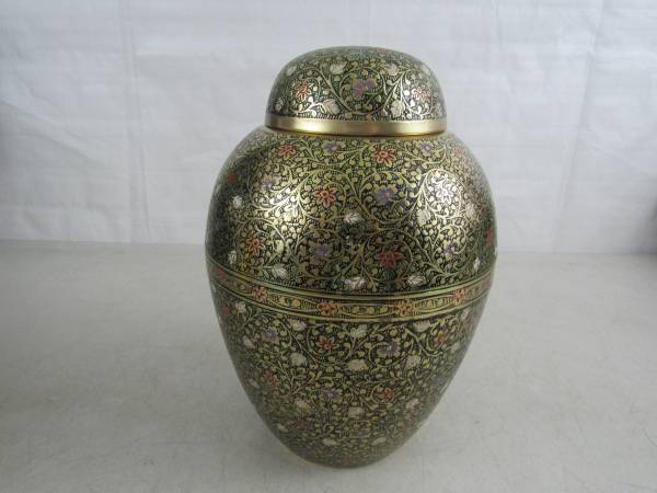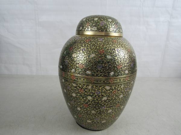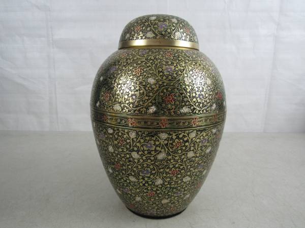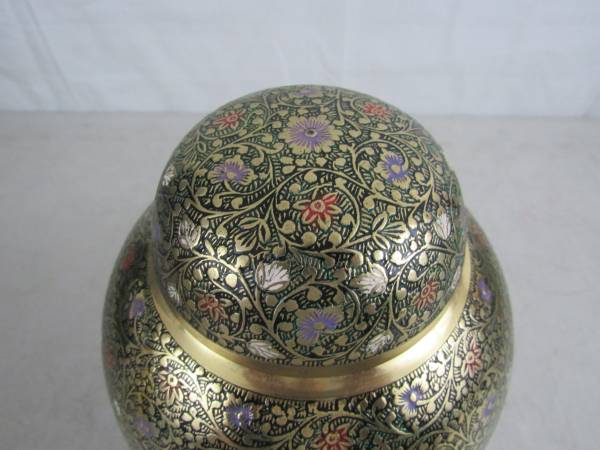 The urn is 10" height X 7" diameter at it's widest point, and weighs 4 pounds. Made of solid brass with hand etched and painted floral design. Good condition with some minor age and usage wear. No...