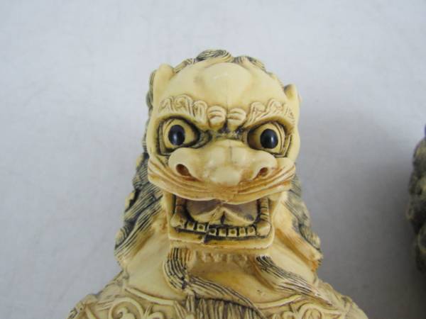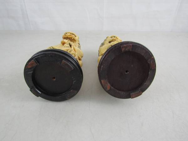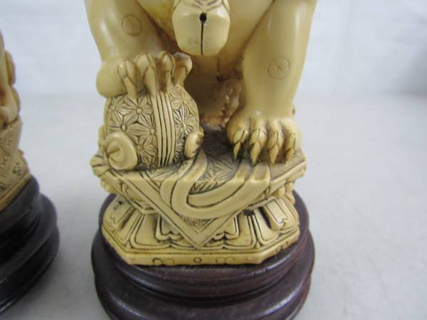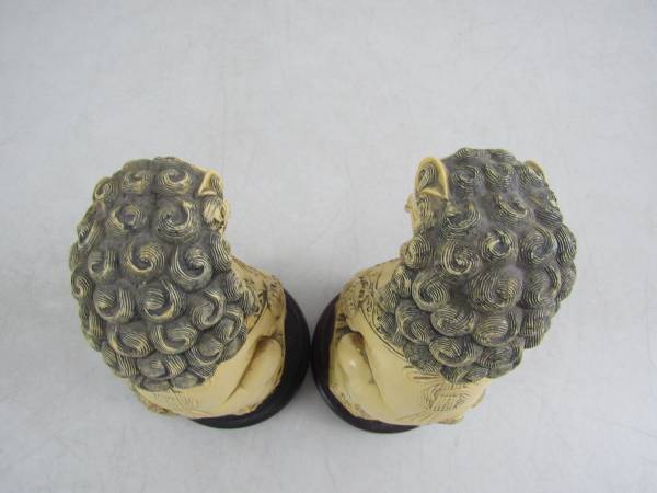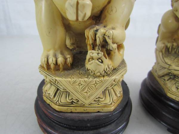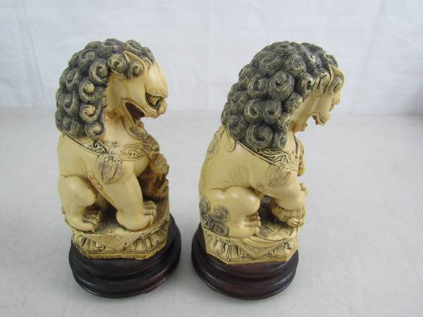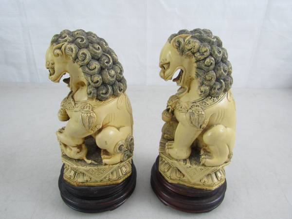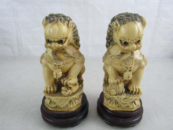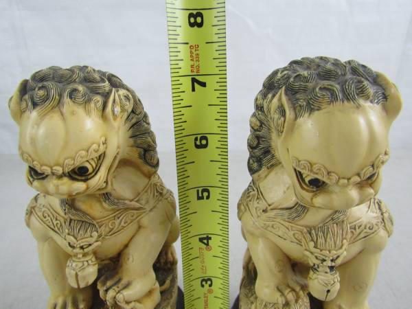 The Foo dogs are 7 1/4" tall each, and weigh just under two pounds apiece. Good condition with some minor age and usage wear. No cracks, chips, or broken parts. See photo's