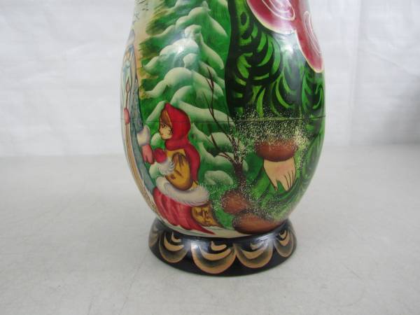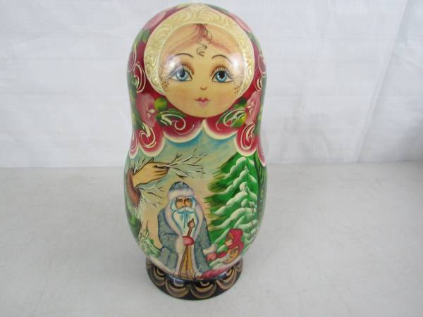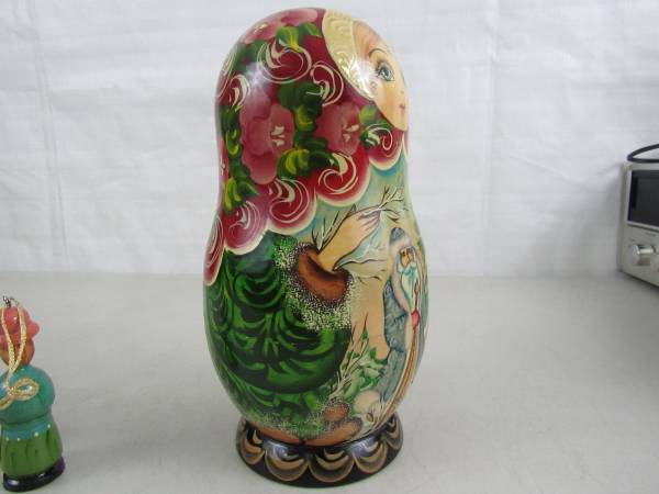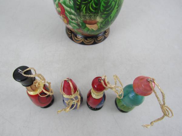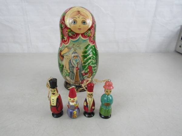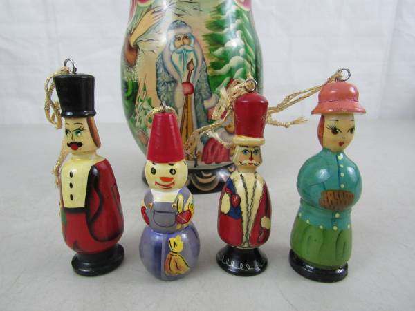 The large Matryoshka doll is 8 3/4" tall, and the ornaments are 3" up to 3 3/4". Made of Russian Birchwood. Good condition with some minor age and usage wear. No broken or missing parts See photo's