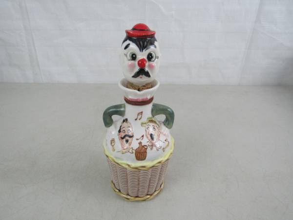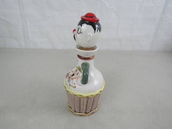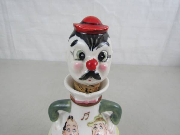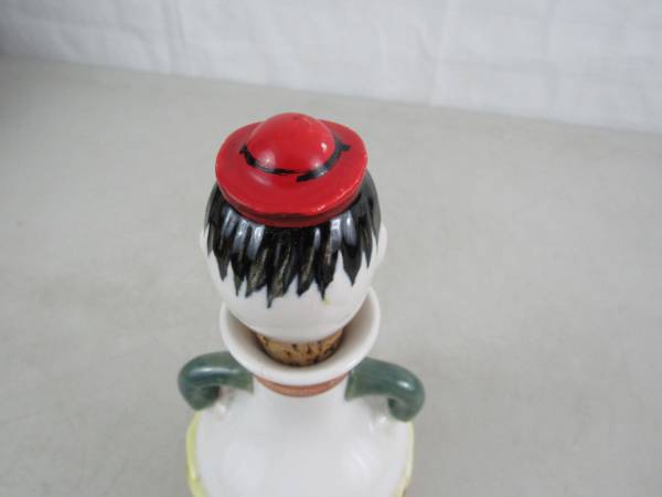 The decanter is 8 1/2" tall, and is in good condition. Has some typical age and usage wear. There is a piece of cork broken off, and there is some crazing ( cracks in the glazing not in the ceramic ) just around decanter pour spout area.Some minor paint wear on the hat.